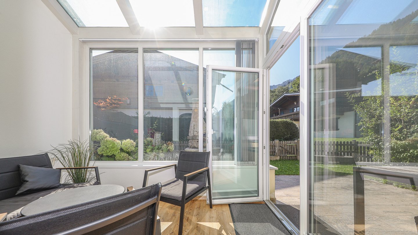 Sodann gelangt man in den großen, hellen Wohnraum, welcher offen in den Wintergarten mündet und sodann in den netten kleinen und völlig pflegeleichten Eck-Garten.