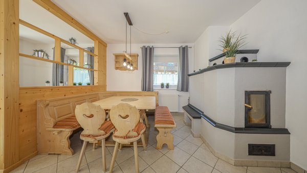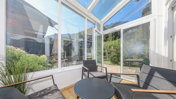Das Wohnzimmer, belegt mit einem Riemenparkettboden, ist räumlich in einen Ess- und Wohnbereich getrennt und verfügt über einen Kachelofen. Der Wintergarten ist entsprechend groß und ist ebenfalls mit Heizkörpern versehen.