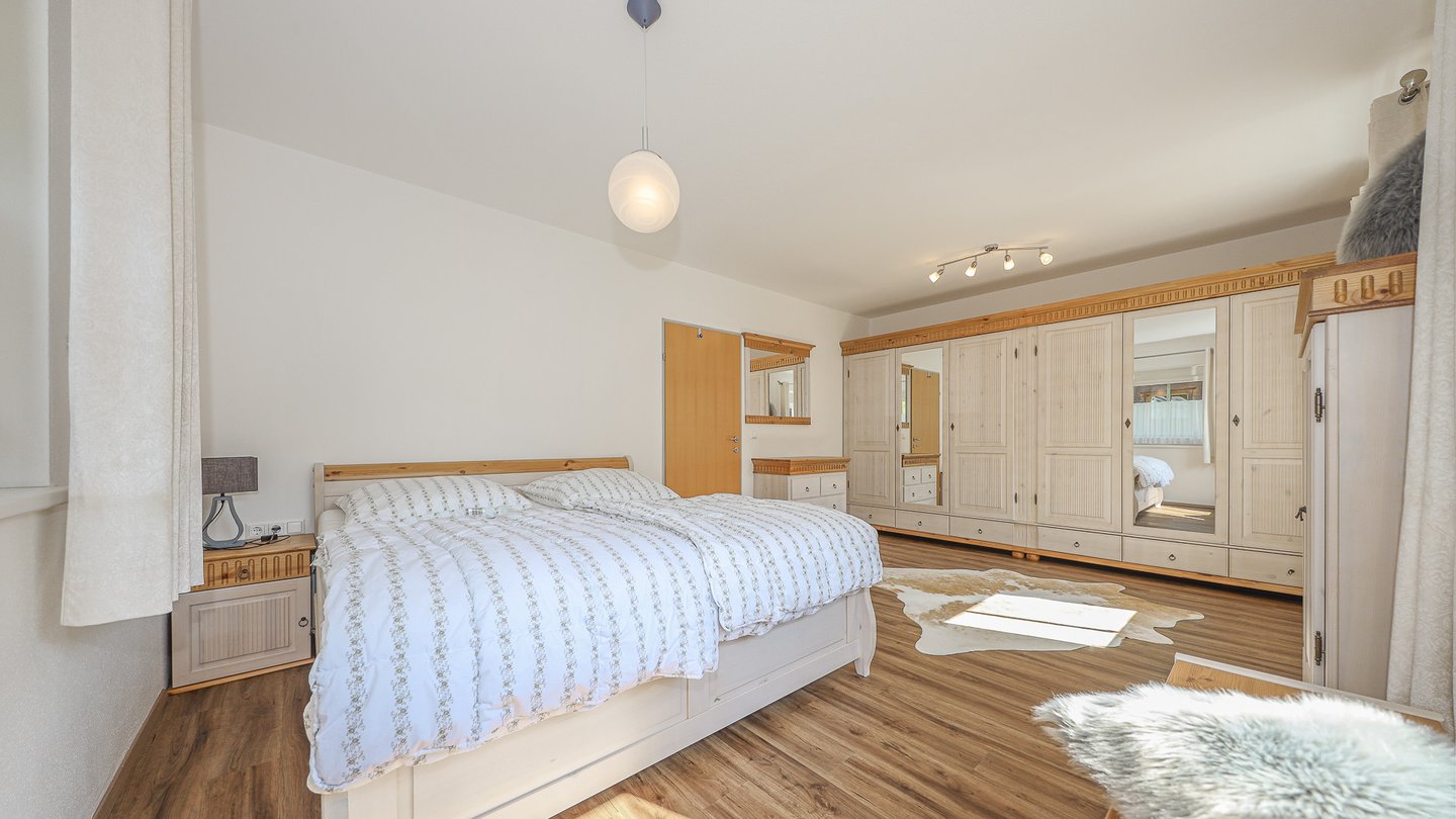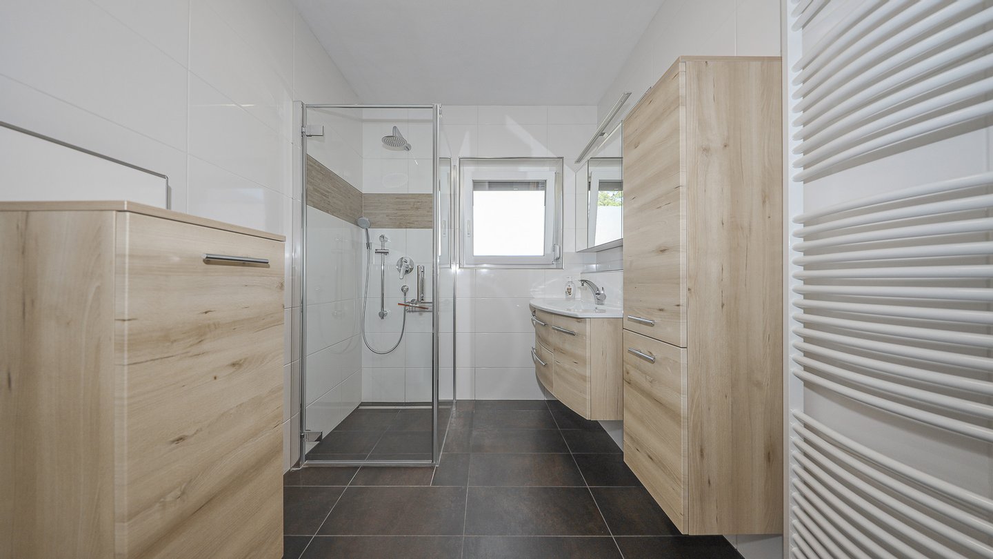 Über die Treppe gelangt man in das Obergeschoss, wo sich ein Abstellraum, ein Badezimmer mit Fenster, Waschtisch, Dusche und WC befindet. Weiters sind hier ein sehr großes sowie ein zweites, etwas kleineres Schlafzimmer vorhanden. Das große Schlafzimmer kann ohne großen Aufwand geteilt werden, sodass man dann über 3 Schlafzimmer verfügt.