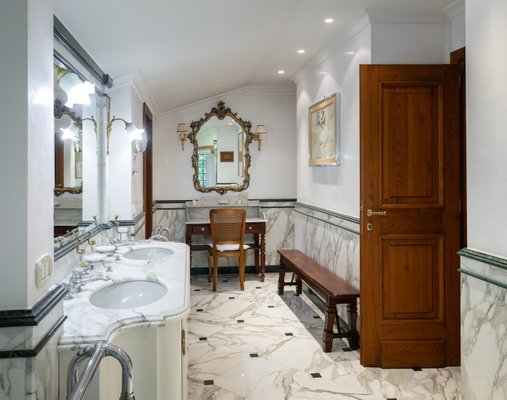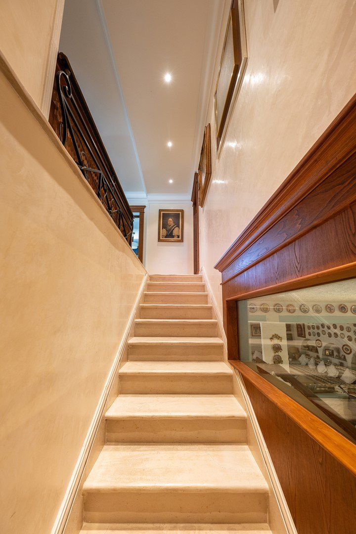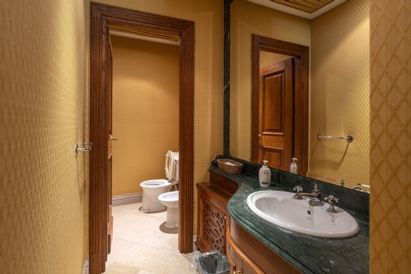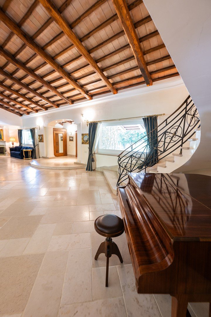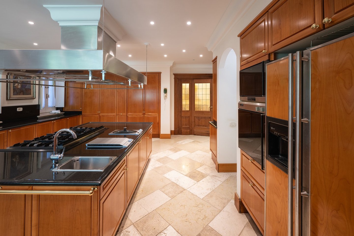 Die 1400 m² große Villa, die sich über drei Ebenen erstreckt, verkörpert eine moderne Ästhetik in einem eleganten Gebäude im klassischen Stil. Im Erdgeschoss befinden sich eine imposante Eingangshalle, ein großes Wohnzimmer mit Doppelkamin, ein Esszimmer mit Blick auf eine Veranda, eine geräumige Küche, ein Arbeitszimmer mit Sekretariat und zwei Badezimmer. Eine majestätische Treppe führt in den ersten Stock, wo vier Schlafzimmer, alle mit eigenem Bad, und eine Master-Suite mit begehbarem Kleiderschrank, Arbeitszimmer und ein Badezimmer mit Whirlpool exklusiven Komfort und Sicherheit bieten, auch dieses Zimmer ist durch eine gepanzerte Tür geschützt.