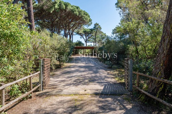 Im Herzen des prestigeträchtigen Wohngebiets und des üppigen Pinienwaldes von Roccamare befindet sich diese bezaubernde Villa von 270 m², umgeben von einem privaten Park von 5200 m². Ein Paradieswinkel nur 200 Meter von der wunderschönen toskanischen