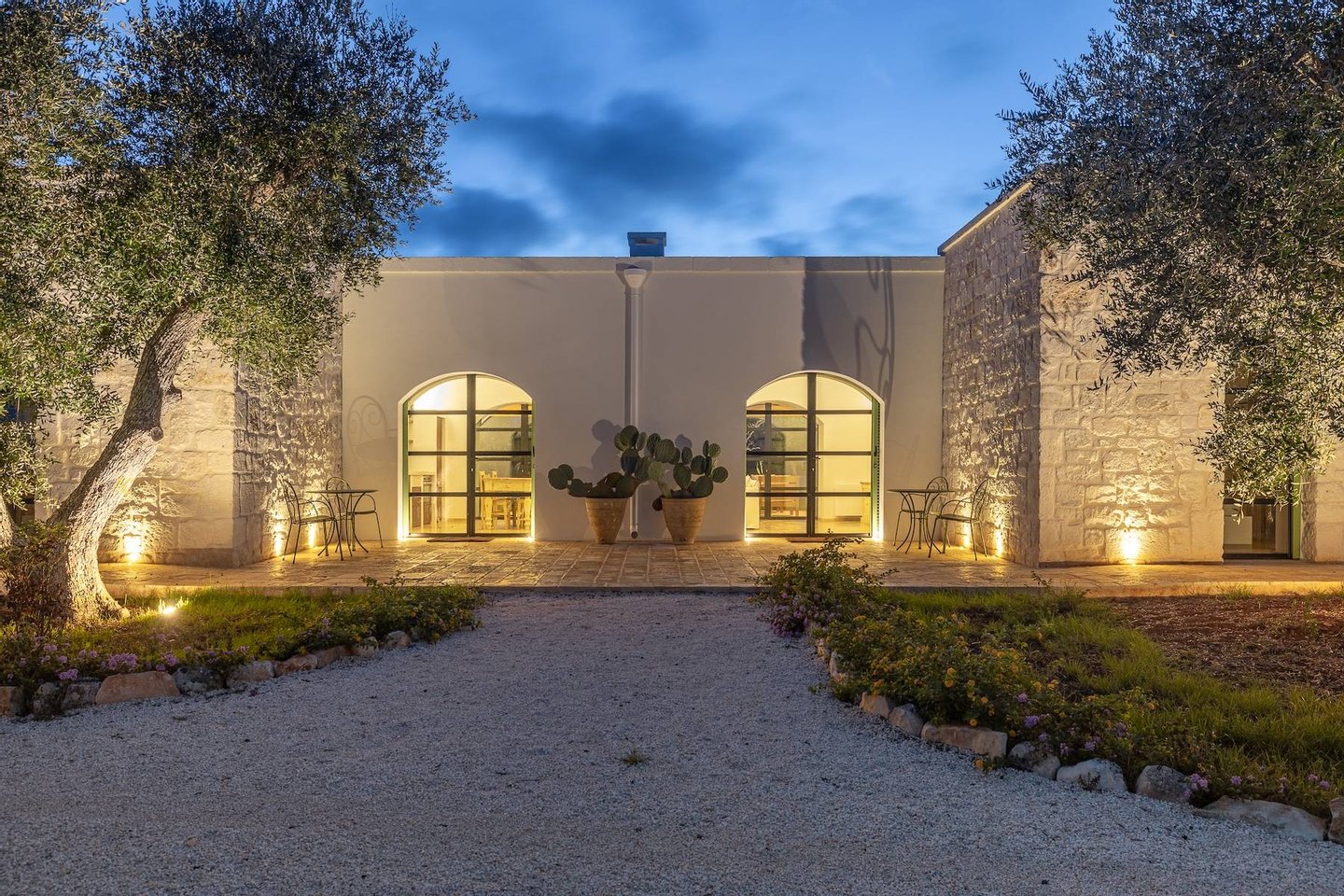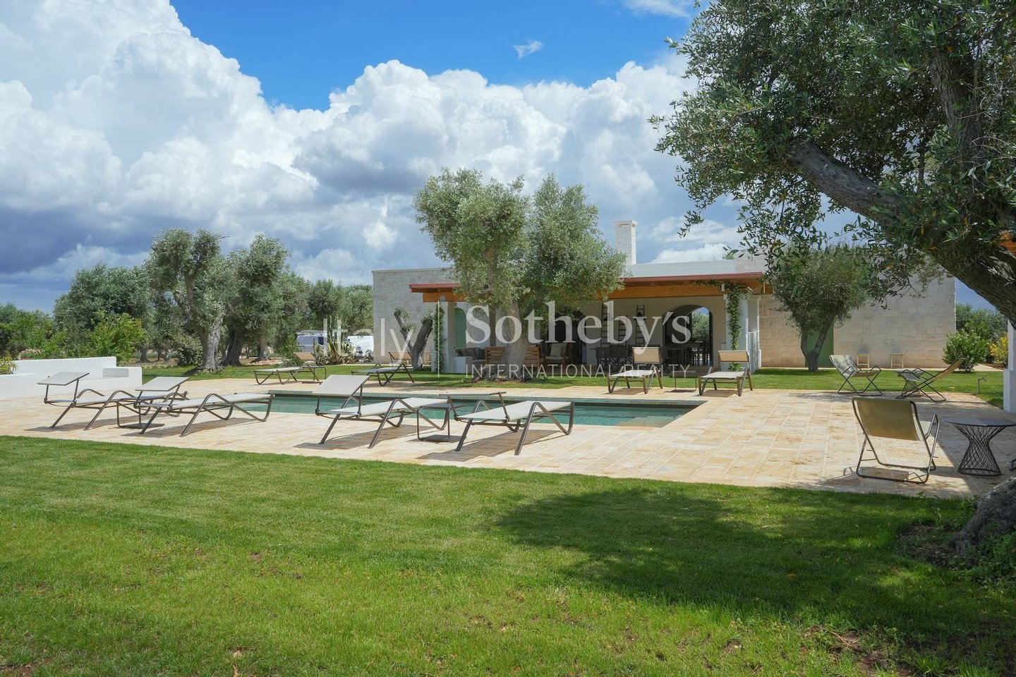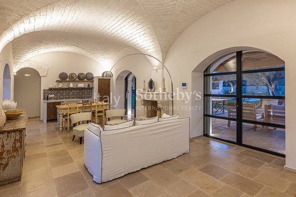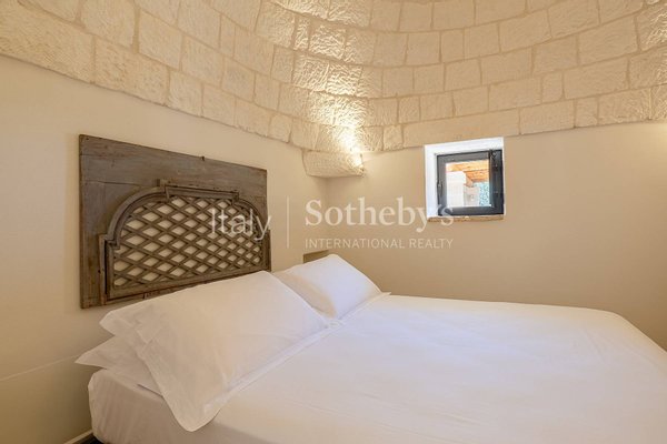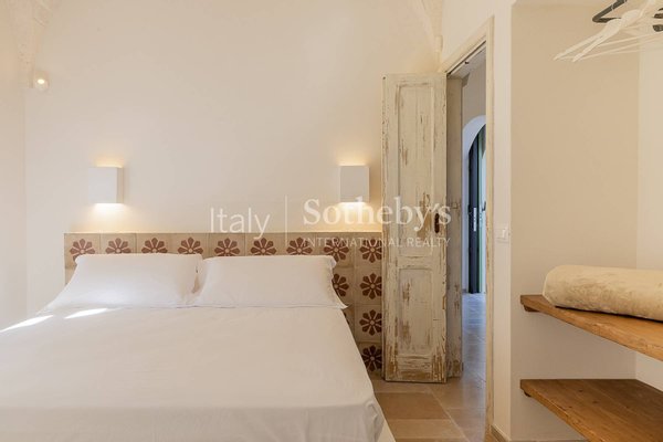 Die Villa, der Trullo und die Lamia, jeweils mit eigenem Pool und großzügigen Außenbereichen, bieten Platz für bis zu 14 Personen und kombinieren sowohl Geselligkeit als auch Privatsphäre. Die Villa verfügt über ein einladendes Wohnzimmer mit einem Steinkamin und einer offenen, gemauerten Küche mit Geräten, die von zwei wunderschönen Sterngewölben aus weißem Stein überdacht wird. Der Schlafbereich umfasst vier Schlafzimmer, jedes mit eigenem Bad und direktem Zugang zum Garten. Außen befindet sich eine Veranda, die Platz für das gesamte Anwesen bietet und einen schönen englischen Rasen überblickt, der den Pool und den überdachten Bereich mit gemauerten Sofas umgibt. Der ikonische Trullo, aus weißem Stein mit drei restaurierten charakteristischen Kegeln, bietet ein Wohnzimmer und zwei Schlafzimmer. Der Außenbereich ist mit zwei Pavillons, einer Außenküche und einem zweiten Infinity-Pool ausgestattet. Die Lamia ist ein äußerst charmantes Gebäude mit einem Schlafzimmer und einem Wohnzimmer mit Steinkamin und Kochnische, das durch eine Treppe zur Panoramaterrasse führt, von der aus man einen herrlichen Blick auf den Olivenhain und den dritten Infinity-Pool genießen kann.