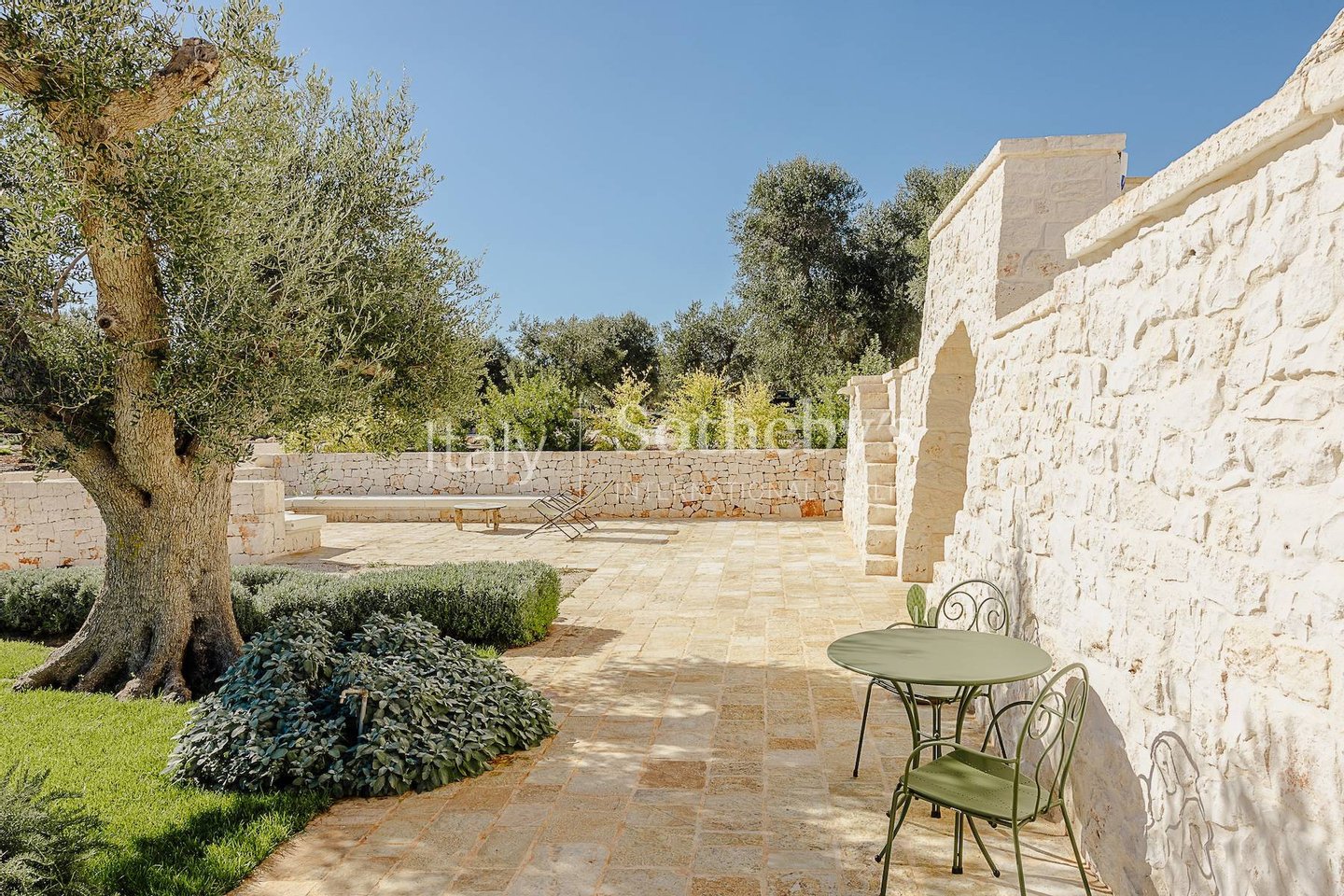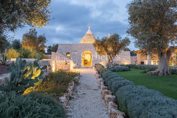 Faszinierendes Anwesen auf einem Hügel mit vier Hektar Olivenbäumen, Obstbäumen und mediterraner Flora, bestehend aus drei sorgfältig restaurierten Gebäuden, die modernen Komfort bieten und gleichzeitig die Tradition des Valle d'Itria respektieren.Die