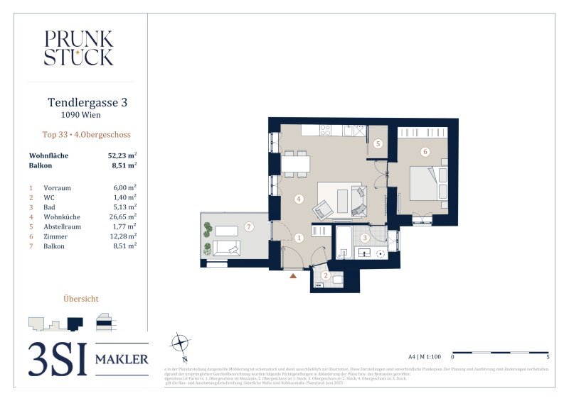Der Wohnbereich mit offener Küche erstreckt sich über großzügige 26,65 m² und bildet das Herzstück der Wohnung. Durch seine offene Gestaltung und die großen Fensterflächen wirkt der Raum lichtdurchflutet und einladend. Von hier aus gelangt man auf den ruhig gelegenen Balkon mit einer Fläche von 8,51 m², der sich ideal für entspannte Stunden im Freien eignet.