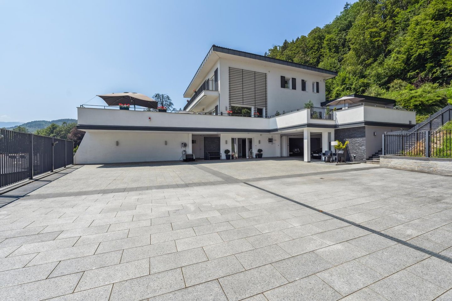 Acht Garagen bieten ausreichend Platz für eine exklusive Fahrzeugkollektion und unterstreichen den außergewöhnlichen Charakter dieser Immobilie. Ein zusätzlicher Luxus ist die Klimaanlage, die für angenehme Temperaturen sorgt, sowie der Lift, der nicht nur für den Transport von Einkäufen und schweren Gegenständen genutzt werden kann, sondern auch problemlos als Personenlift umgebaut werden kann.