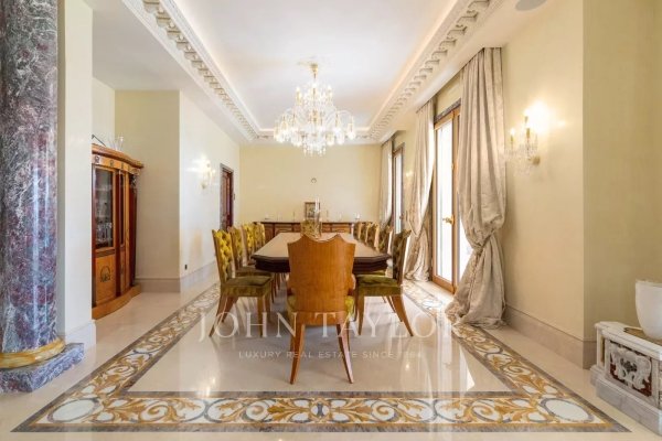 Eingangshalle, 80 qm Wohn- und Esszimmer, professionelle Küche, 6 Schlafzimmer mit Bädern. Fitnessraum, Kinoraum.