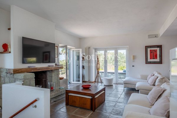 Im Obergeschoss öffnet sich die Villa zu einem lichtdurchfluteten Wohnzimmer mit zwei Wohnbereichen, das durch einen gemütlichen Kamin und einen edlen Terrakottaboden aufgewertet wird. Zahlreiche Fenster ermöglichen einen herrlichen Panoramablick auf das Meer. Die voll ausgestattete Küche ist sowohl einladend als auch funktional. Auf dieser Ebene befinden sich zwei Schlafzimmer sowie ein stilvolles Badezimmer.