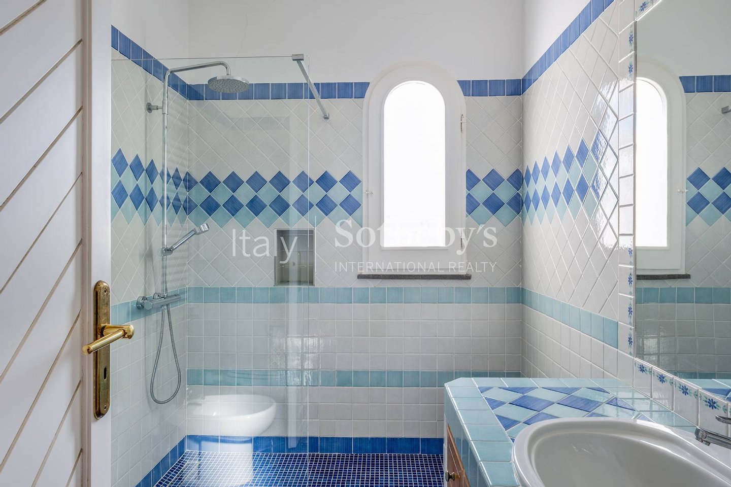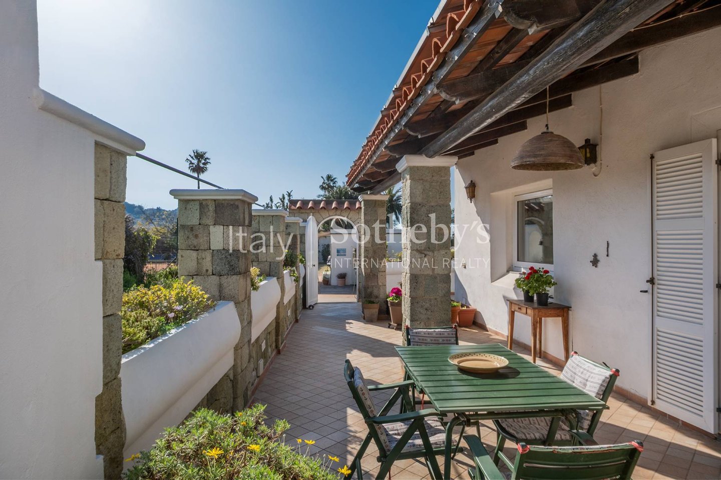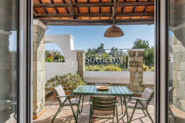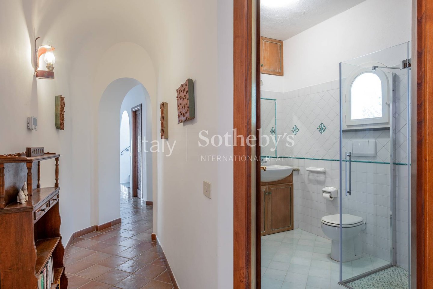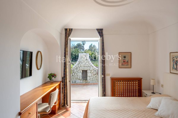 Eingebettet in eine ruhige Wohngegend von Forio bietet diese prachtvolle Immobilie großzügige Räume, die Komfort und Vielseitigkeit vereinen. Die Villa erstreckt sich über eine einzige Ebene und verfügt über ein einladendes Wohnzimmer mit Kamin sowie ein Esszimmer, das an die gut ausgestattete Küche angrenzt. Diese ist mit edlen dunklen Holzelementen versehen, die eine warme und elegante Atmosphäre schaffen.