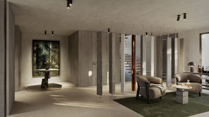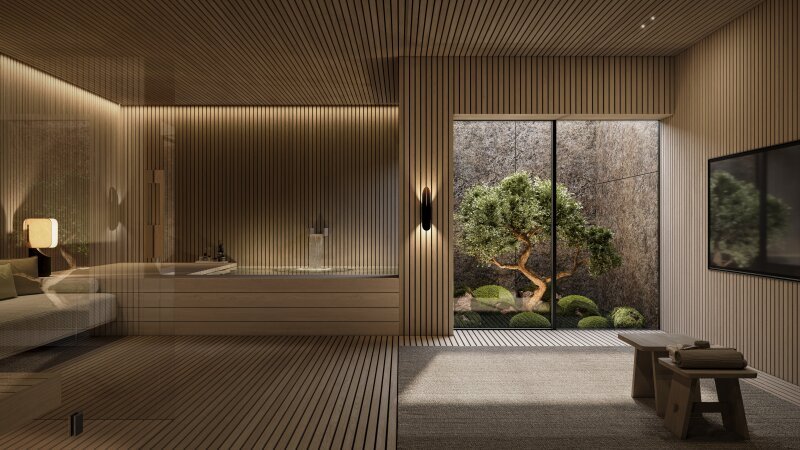 Ein exklusiver Wellnessbereich im Untergeschoß des Hauses bietet Entspannung pur mit einer Sauna, Whirlpool, Daybeds, einer Bar und einem Lichthof, der durch eine Schiebetür zugänglich ist. Ein Hauswirtschaftsraum, zwei Lagerräume und ein Technikraum schließen sich an.
