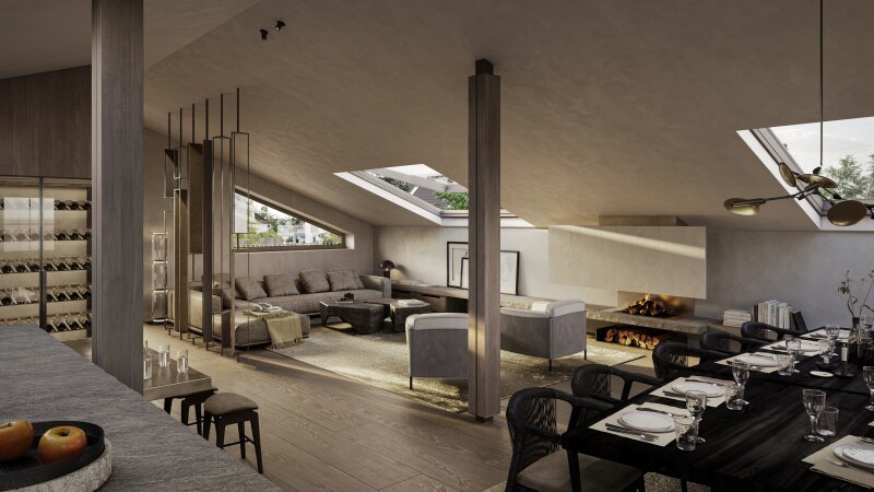 Ein weiteres Highlight ist das Dachgeschoss mit großzügig gestaltetem Wohn-Essbereich mit Sichtdachstuhl und Kamin, hochwertiger Küche samt Kochinsel, Vorratsraum und Weinklimaschränken.