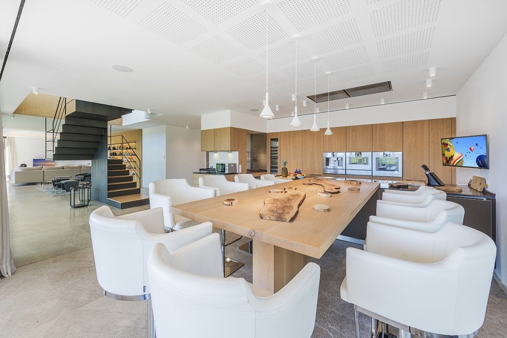 Das Erdgeschoss ist dem offenen Wohnen und der Unterhaltung gewidmet und verfügt über eine elegante Bultaup-Designerküche, einen großen Wohn- und Essbereich, einen Kinoraum und eine weitläufige überdachte Terrasse, die den Innenraum nach außen erweitert.