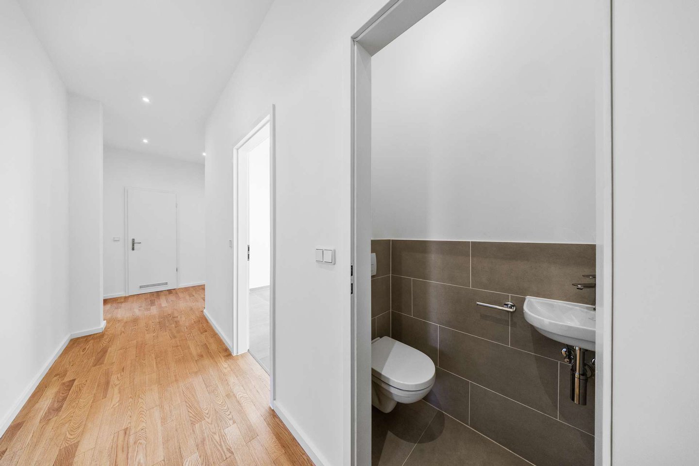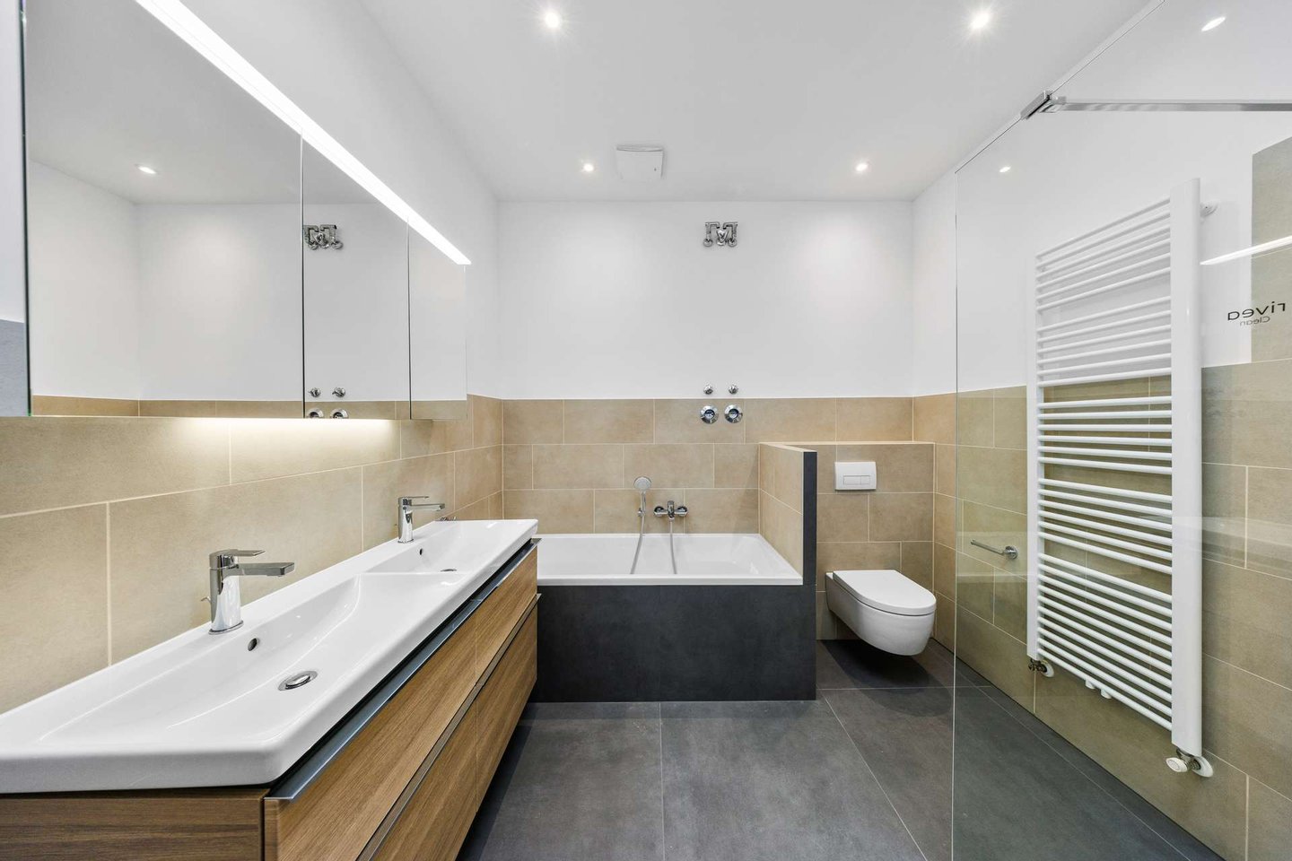 Das Tageslichtbad ist mit bodengleicher Dusche, Badewanne, Doppelwaschtisch und hochwertigen Armaturen von Villeroy & Boch ausgestattet. Fußbodenheizung und Handtuchwärmer bieten zusätzlichen Komfort. Ein separates Gäste-WC und frisch abgezogenes Eichenparkett unterstreichen die stilvolle Ausstattung. Die neu geflieste Wohnküche wartet auf Ihre individuelle Gestaltung; ein Abluftanschluss sorgt für effektive Geruchsableitung.