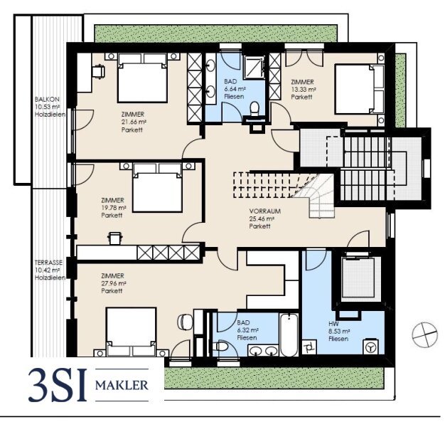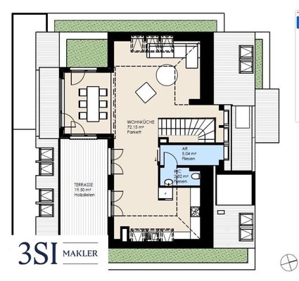 Die Wohnung verfügt über insgesamt 5 lichtdurchflutete Zimmer, die Ihnen viel Raum für individuelle Gestaltung bieten. Die offene Wohnküche ist der perfekte Ort für gesellige Abende mit Freunden und Familie. Hier genießen Sie nicht nur das Kochen, sondern auch den Zugang zu Ihrem Südbalkon und den zwei Terrassen, die Ihnen einen atemberaubenden Grünblick bieten.