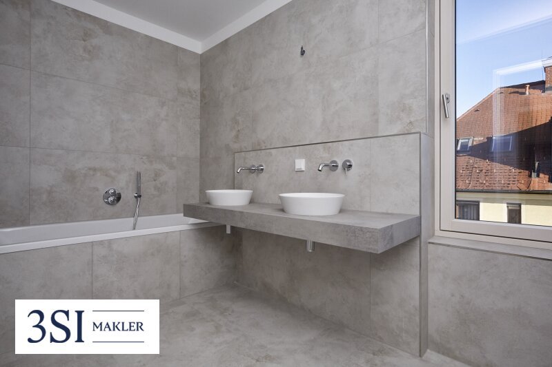 - Großformatige Feinsteinzeugfliesen in Bädern und WCs.