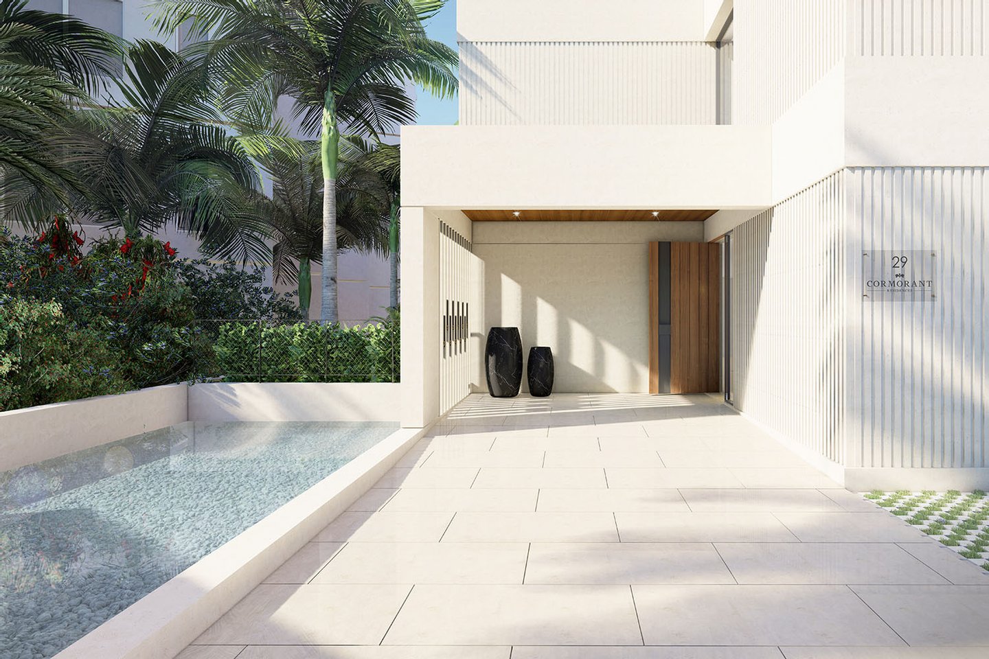 Die Residenz liegt in einer ruhigen Anwohnerstraße und bietet ihren Bewohnern eine Gemeinschaftsterrasse mit Infinity-Pool, einen SPA-Bereich mit Sauna und Gym, Abstellräume sowie eine Tiefgarage mit E-Ladestation und PKW-Stellplätze.
