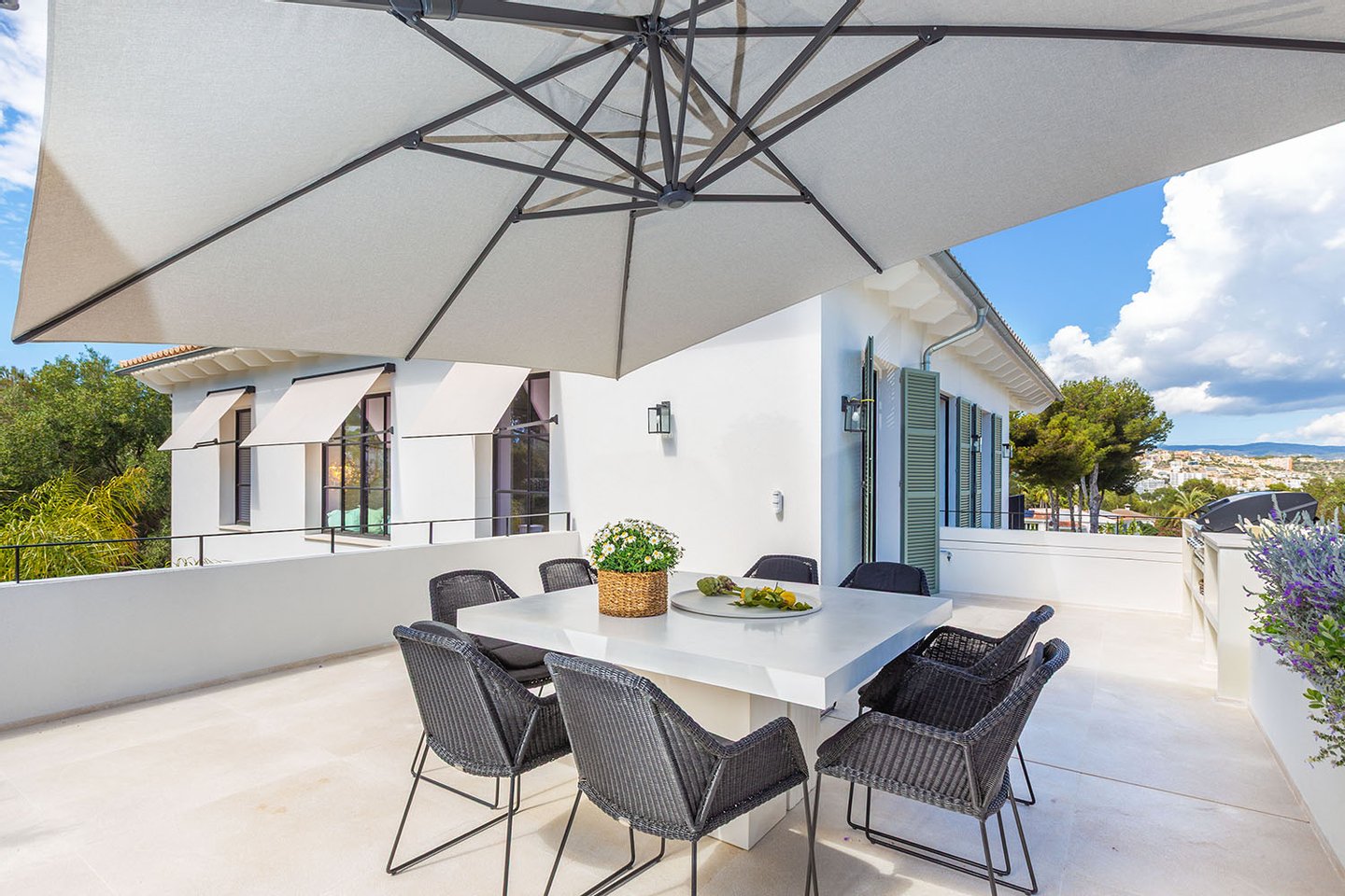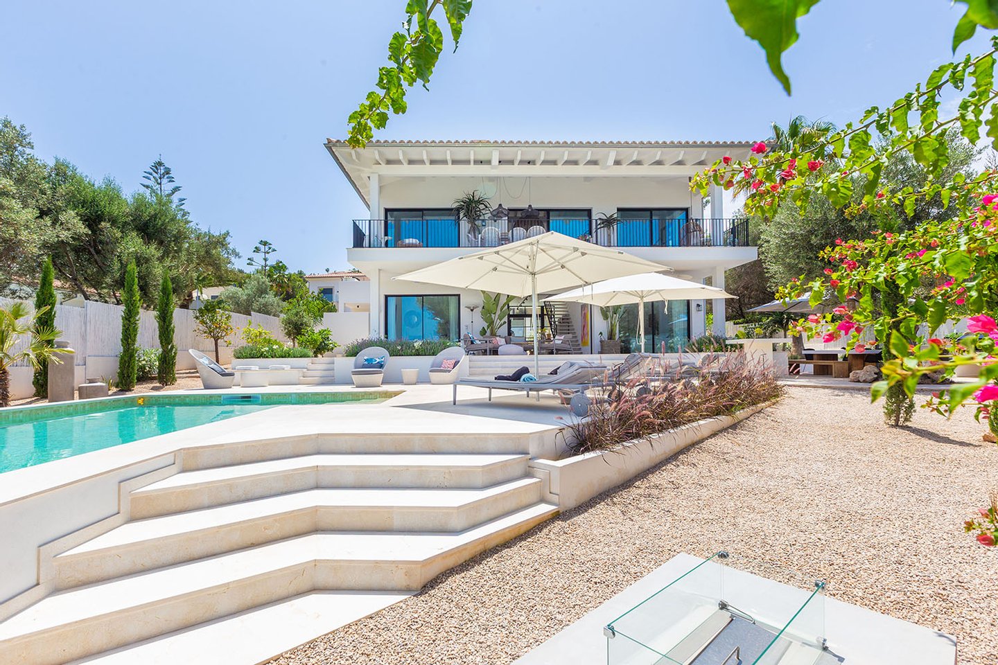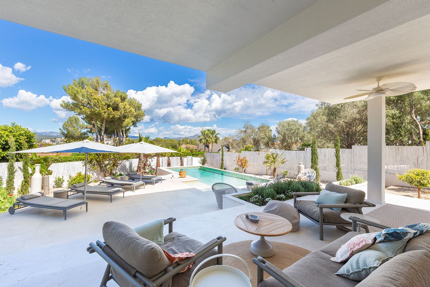 Auch der Außenbereich wurde mit großer Sorgfalt gestaltet. Die liebevoll gestalteten Terrassen, der automatisch bewässerte Garten mit BBQ-Bereich, der beheizte Salzwasserpool und die Außendusche bieten alles, was man an warmen Tagen braucht, um den Luxus und die Entspannung in vollen Zügen zu genießen.