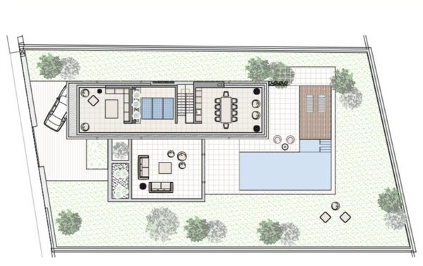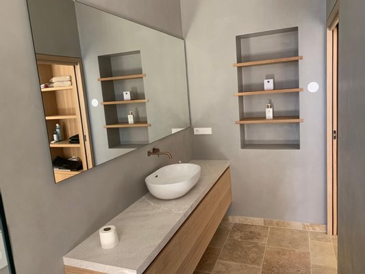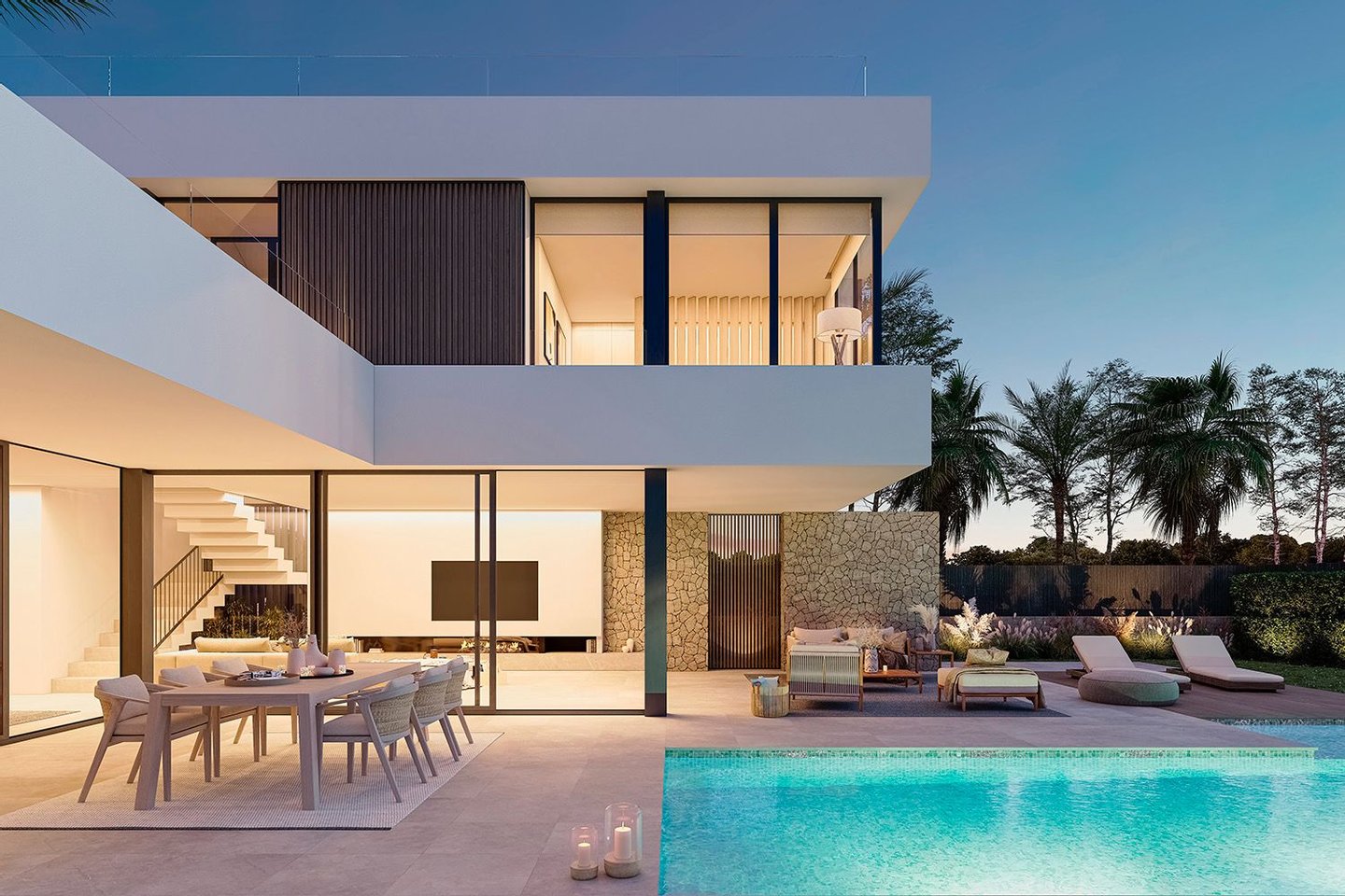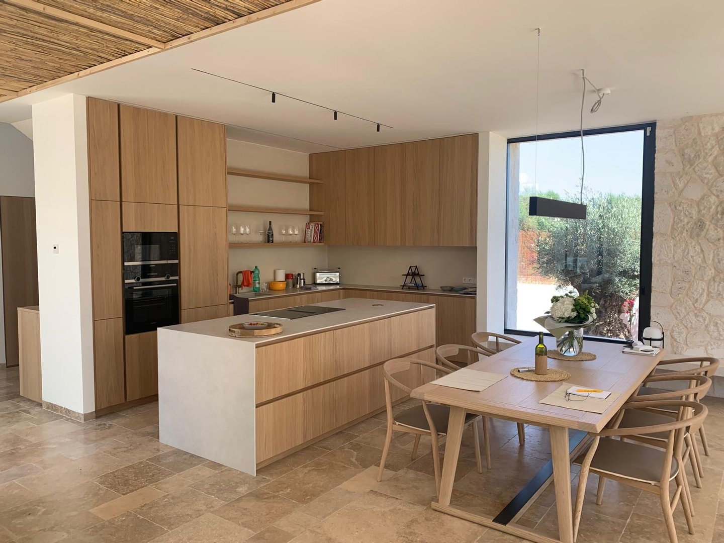 Auf zwei Etagen vereint das Anwesen modernes Design mit mediterranem Charme. Traditionelle Natursteinwände treffen auf zeitgemäße Elemente aus Stahl, Aluminium und Glas – eine stilvolle Symbiose, die Exklusivität und Gemütlichkeit perfekt verbindet. Designmöbel können optional erworben werden, um das luxuriöse Ambiente weiter zu unterstreichen.