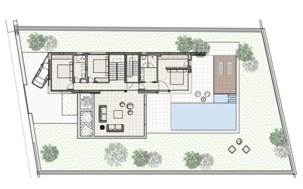 Im Obergeschoss erwarten Sie drei großzügige Schlafzimmer, die Rückzug und Komfort bieten. Das Hauptschlafzimmer verfügt über ein eigenes Badezimmer, während die beiden weiteren Zimmer sich ein geräumiges Bad teilen. Eine offene Terrasse erweitert den Wohnraum ins Freie und eröffnet einen malerischen Blick auf die umliegende Landschaft sowie den Poolbereich.