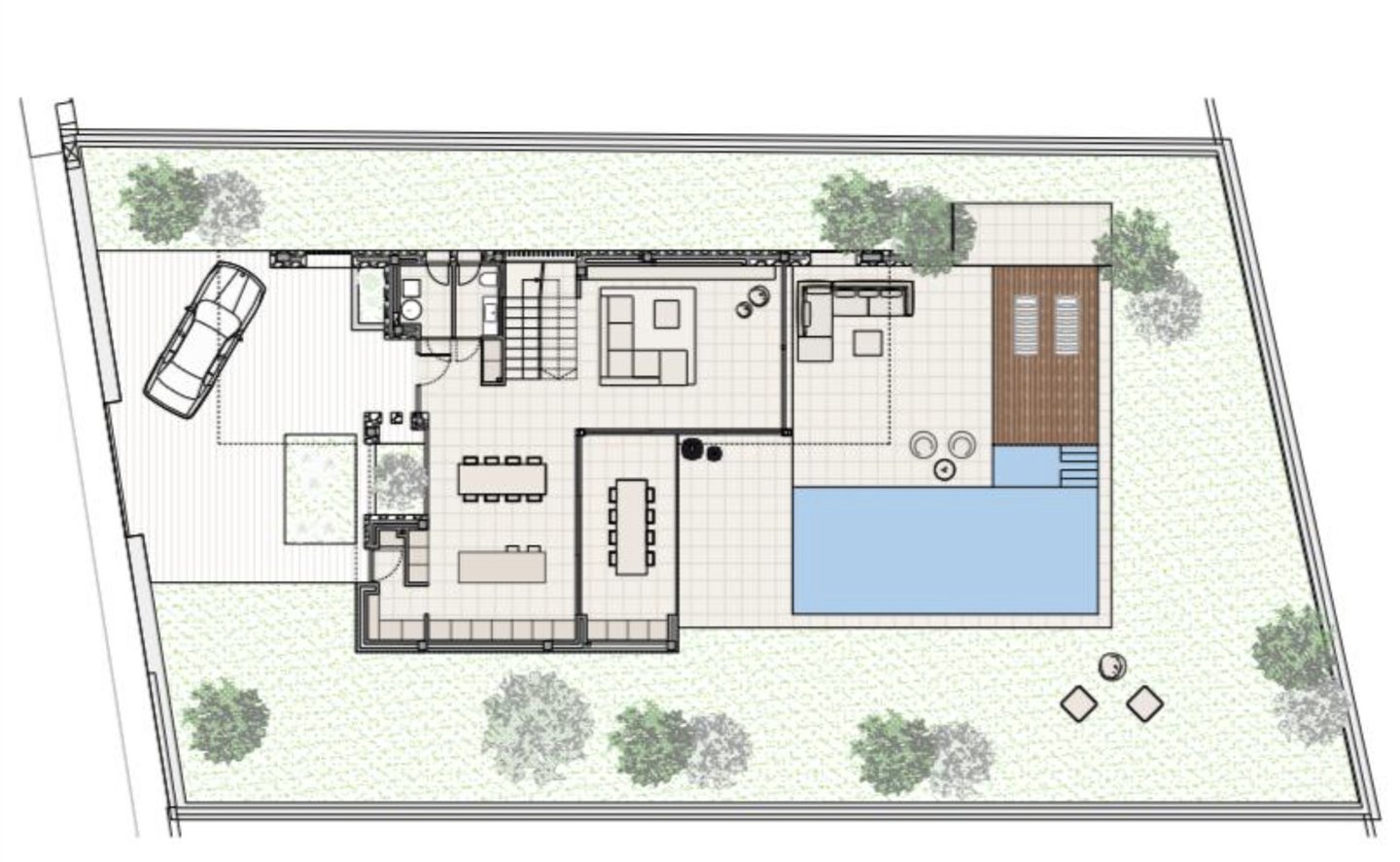 Das Erdgeschoss beeindruckt mit einem weitläufigen Wohn- und Essbereich, der dank großflächiger Fenster in ein harmonisches Zusammenspiel mit der Natur tritt. Ein Bioethanol-Kamin sorgt für eine gemütliche Atmosphäre, während die offene, voll ausgestattete Küche zum geselligen Kochen einlädt. Direkt angrenzend befindet sich die überdachte Terrasse, die fließend in die elegante Poollandschaft mit stilvollem Pooldeck übergeht – ein perfekter Ort zum Entspannen.