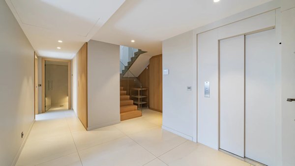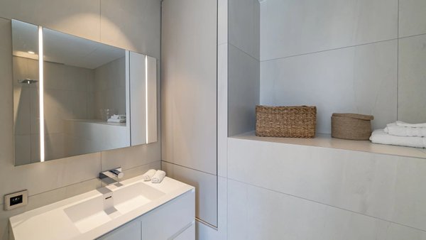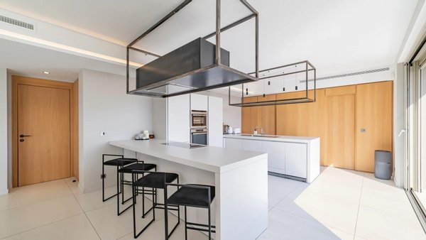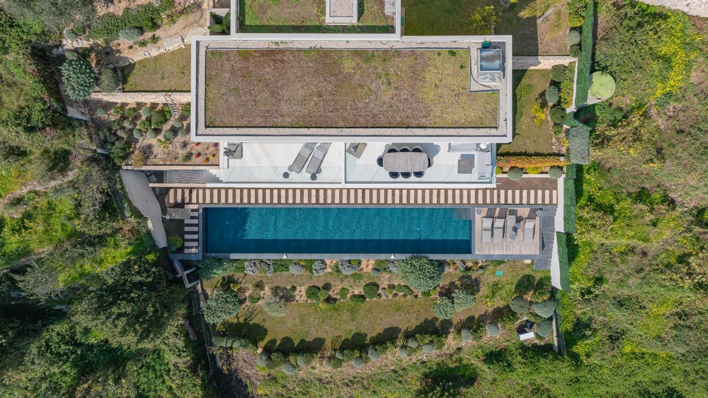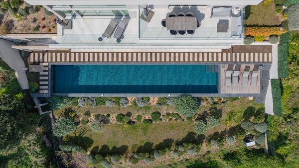 Die Villa erstreckt sich über drei Ebenen, die alle durch einen Aufzug verbunden sind, und präsentiert helle, offene Volumen und ein raffiniertes, modernes Design.