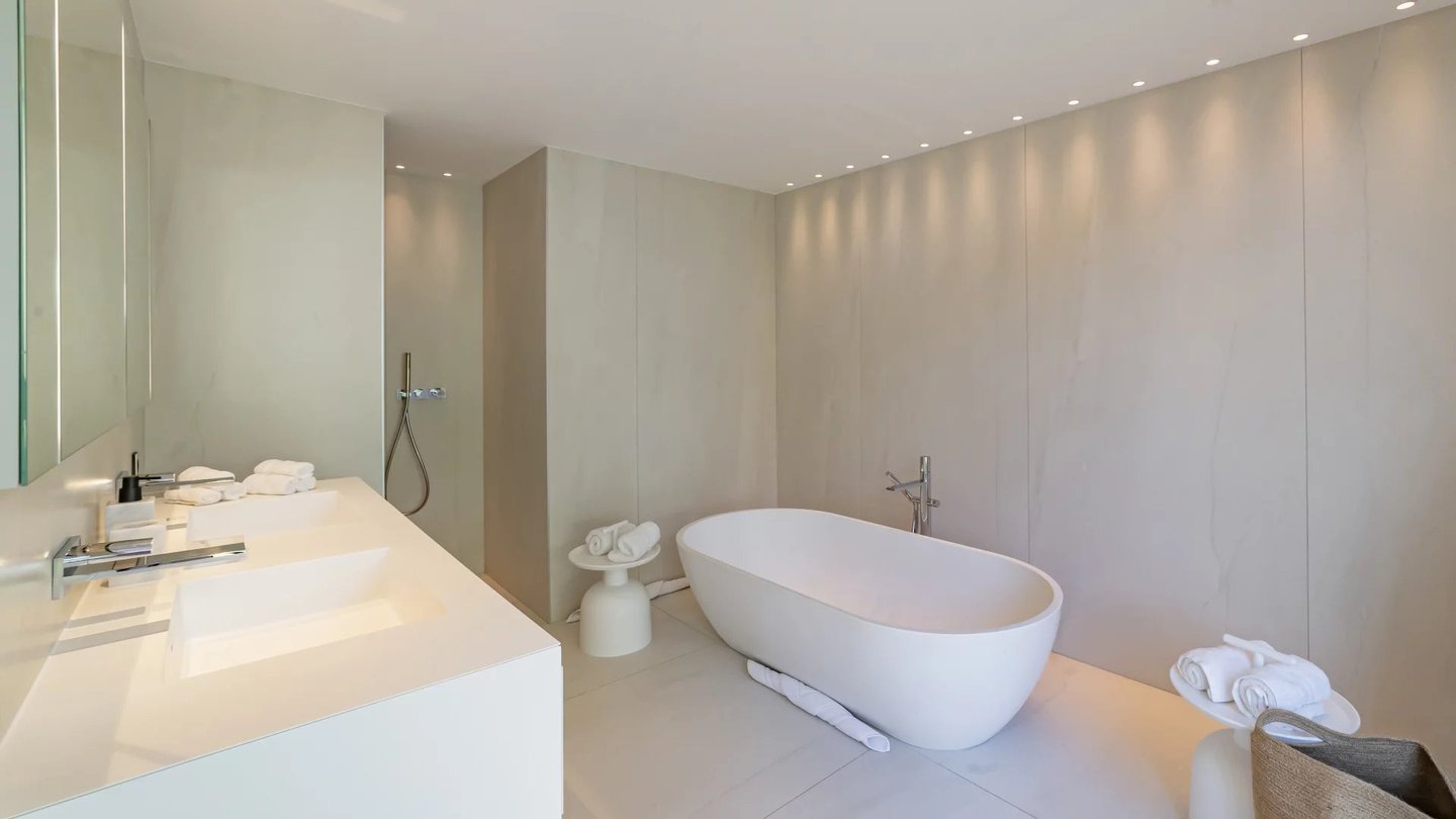 Gartenebene: Vier Schlafzimmer mit eigenem Bad, ein Hammam, viel eingebauter Stauraum und direkter Zugang zum Pool und den Gärten im mediterranen Stil.