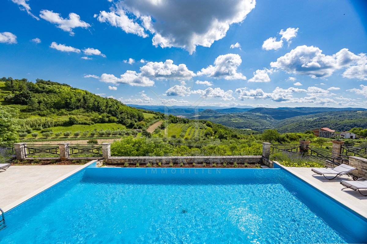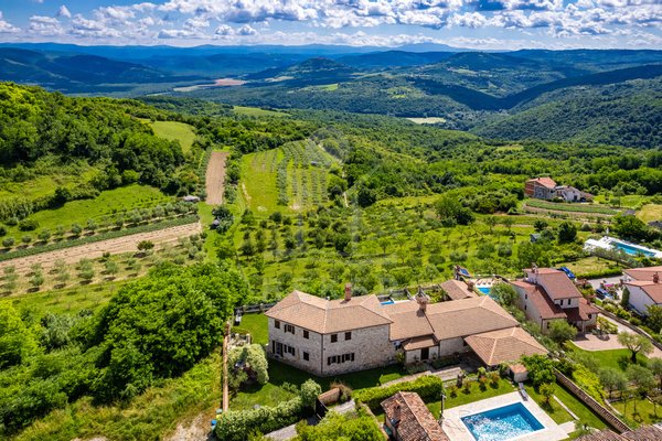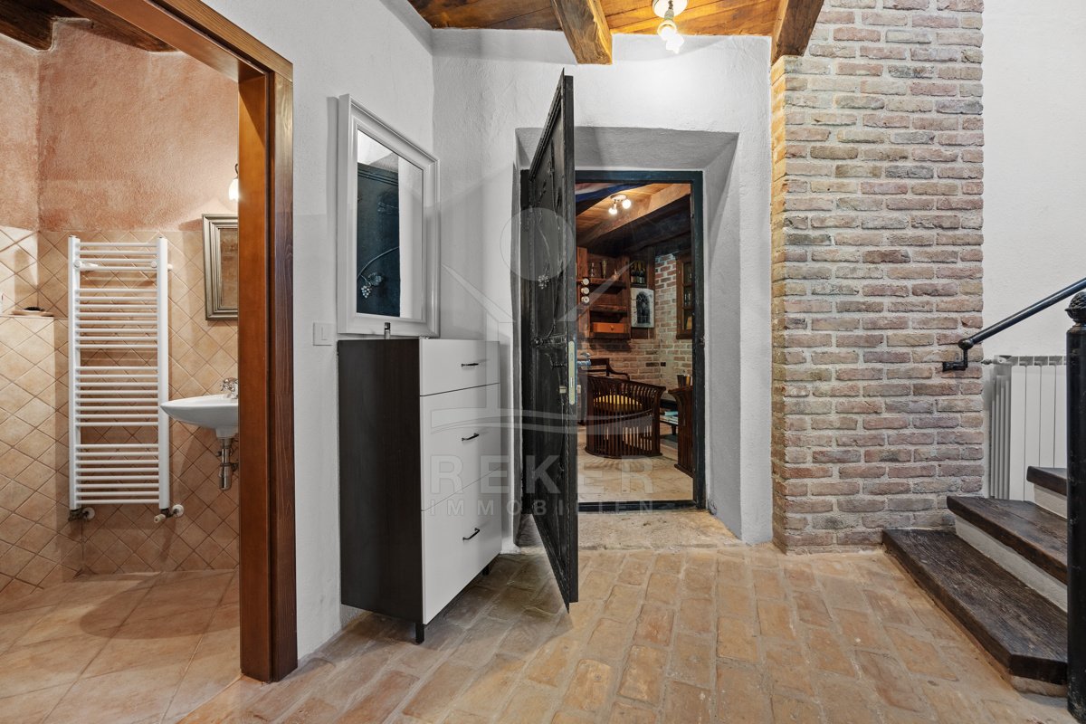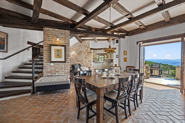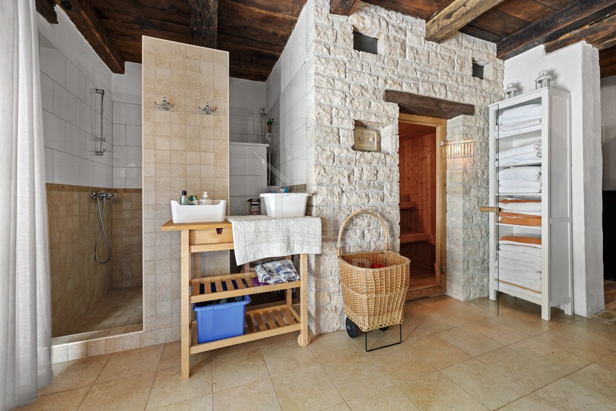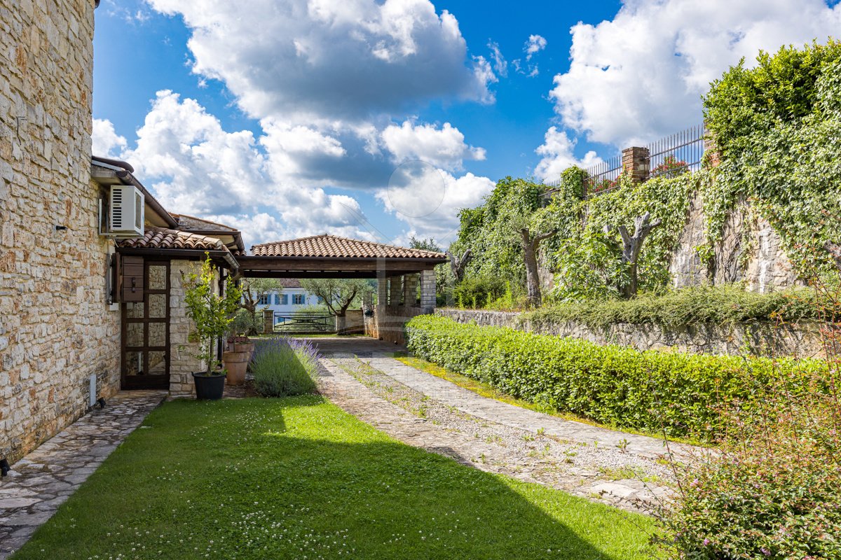 Grünes Glück trifft auf rustikale Eleganz: Großzügige Räume, 4 Schlafzimmer mit Bad en suite, edle Materialien und eine Outdoor-Oase mit Pool und Pavillon laden ein zum Entschleunigen – mitten in der Natur Istriens.