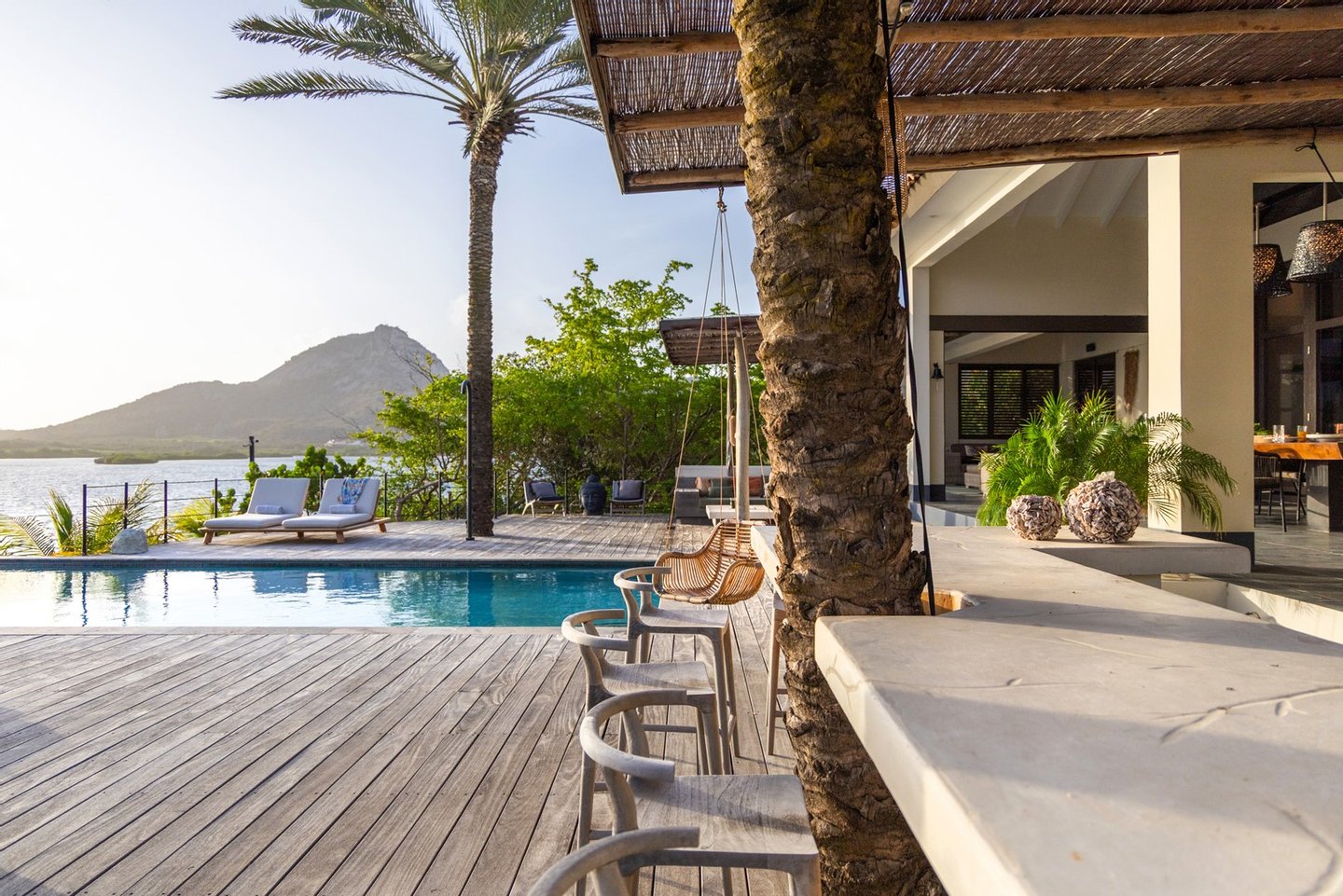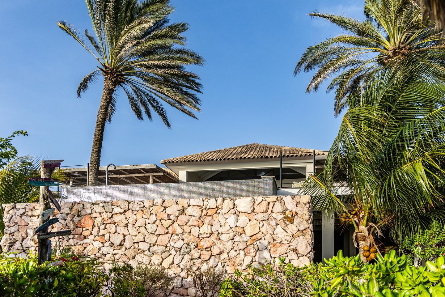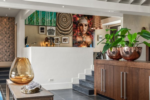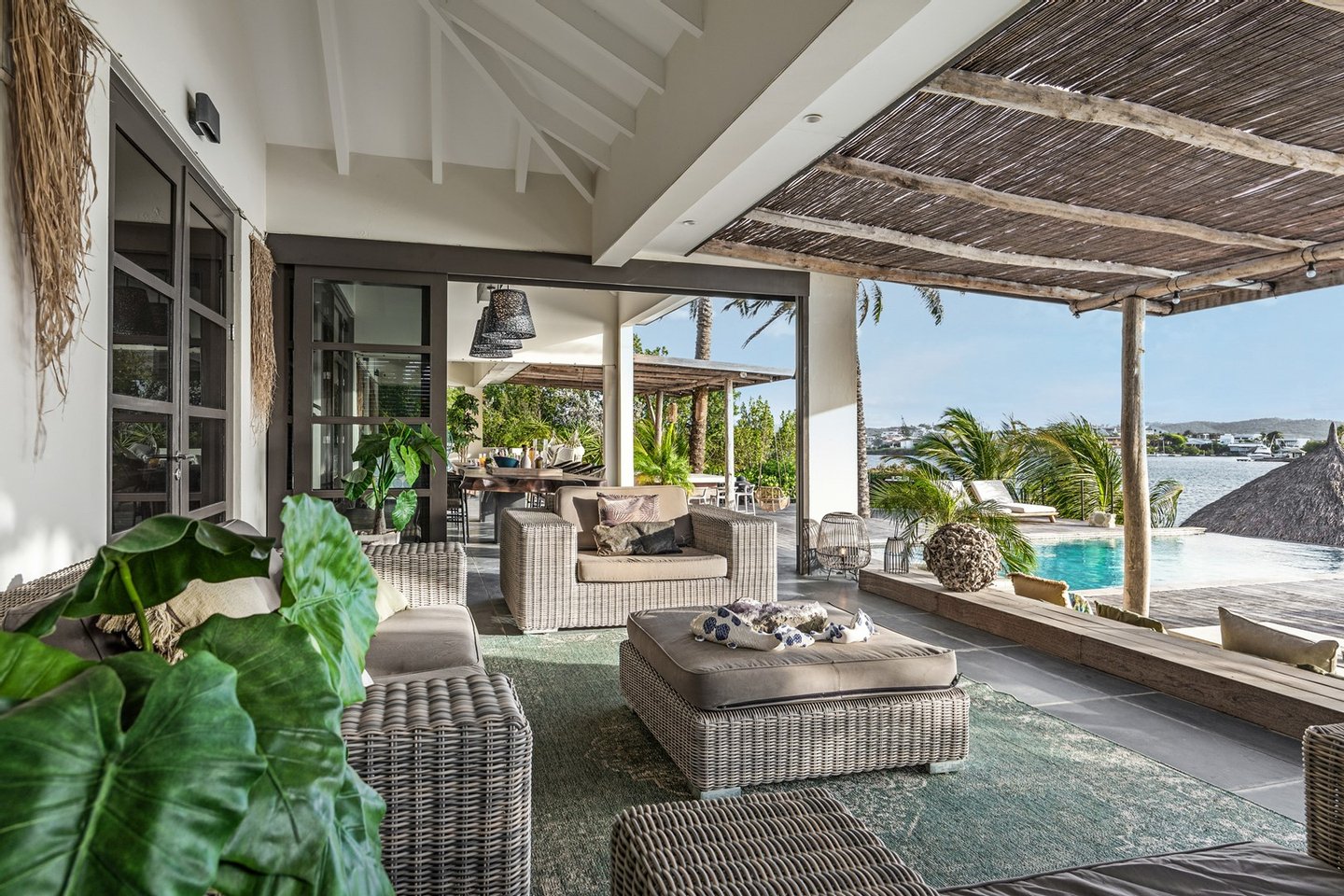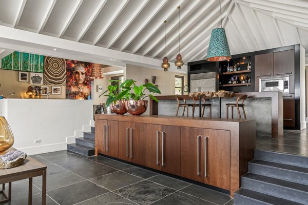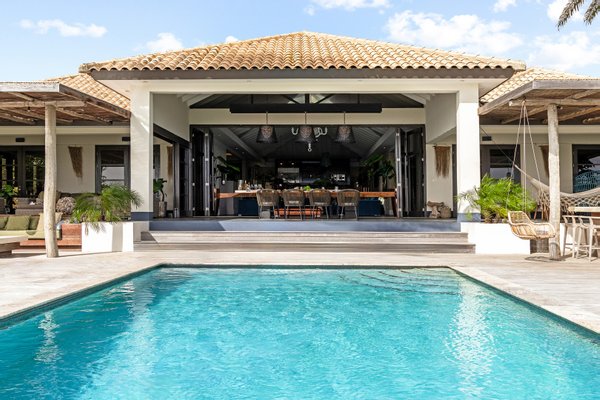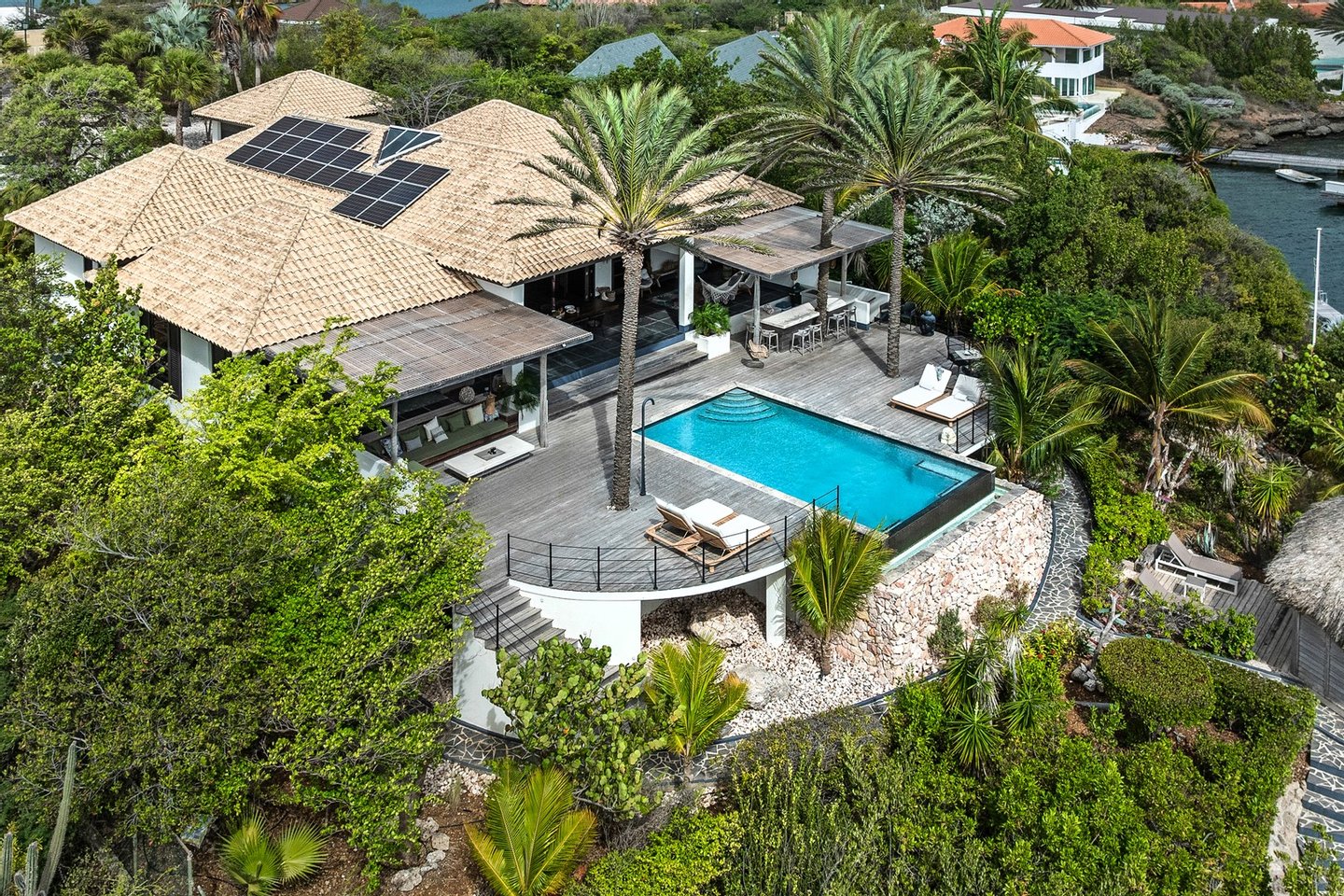 Diese opulente Villa befindet sich im geschlossenen Resort Santa Barbara Plantation-Curaçao am Ufer des Spanish Water. Der Privatstrand und das Dock sind nicht nur eine willkommene Ergänzung, sondern auch eine einzigartige Ergänzung zu den luxuriösen Wohneinrichtungen. Seru Boca Estate ist eine exklusive Wohnanlage in einer der sichersten Lagen auf Curaçao, die professionelle Sicherheit bietet, auch auf dem Wasser. Wassersportarten sind in dieser Region leicht zugänglich, was sie neben dem Golfen zu einem beliebten Zeitvertreib macht. Das ist keine Überraschung, denn das Resort beherbergt den Pete Dye Old Quarry Golf Course, der als der schönste Golfplatz der Karibik gefeiert wurde. Diese Villa ist ein wahres Juwel, in dem alle Ihre Wohnträume wahr werden. Es garantiert vollkommene Ruhe, Entspannung und Genuss. Der herrschaftliche, exklusive Charakter der Villa wird durch ihre symmetrische Architektur unterstrichen. In dem Moment, in dem Sie den pulsierenden Eingang betreten, ist es offensichtlich, dass Raum, Ruhe, Gemütlichkeit und Farbe perfekt miteinander harmonieren. Die Wand im Foyer ist mit bunten Dschungeltapeten geschmückt, die Möbel und Accessoires in den anderen Räumen sind in verschiedenen warmen Tönen gestaltet. Der Kontrast mit der ruhigen Basis aus hellen Farbtönen schafft ein ruhiges und komfortables Ambiente. Überall in der Villa werden Sie die Schieferfliesenböden, die weiß verputzten Wände und die passenden Holztüren bemerken. Dieses atemberaubende Haus verfügt außerdem über 6 Schlafzimmer, 5 Badezimmer, eine Palapa und eine Außenküche. Dank der Verwendung hochwertiger Materialien, verspielter Architektur, luxuriöser Ausstattung und zahlreicher nachhaltiger Ausstattungsmerkmale harmoniert diese sensationelle Villa perfekt mit ihrer Umgebung. Mit allen Einrichtungen in Reichweite ist dies ein privates Paradies an einem der schönsten Orte von Curaçao. Wenn Sie jemals einen Tapetenwechsel erleben möchten, bietet Santa Barbara eine Fülle von Sport- und Freizeitaktivitäten, darunter ein exklusives Restaurant mit verlockenden Gerichten. Aus dem Leben wie ein König in Frankreich ist geworden: Leben wie ein König auf Curaçao! Baustatus/Grundstück Merkmale: Baujahr: 2020 Baustil: Modern mit Split-Level-Elementen Wohnfläche: 769 m² Grundstücksfläche: 2820 m² Dach: Südeuropäische Dachziegel und Sonnenkollektoren Holzfensterrahmen 6 Schlafzimmer 5 Badezimmer 1 Gäste-WC Großer Infinity-Pool Privatstrand und Dock Außenküche Palapa Technische und praktische Details: 43 Sonnenkollektoren High-End-Geräte Home-Soundsystem Deckenventilatoren Eingebaute Beleuchtung Sicherheitssystem Moskitovernebelungssystem Renovierungen: Sowohl die Innen- als auch die Außenpflege sind auf dem neuesten Stand. In den letzten Jahren wurde die Villa in Etappen renoviert. Die Terrasse, die ursprünglich mehrere Ebenen hatte und auf der sich der Pool einen Meter höher befand, wurde eingeebnet. Die hölzernen Terrassenbalken wurden durch Beton ersetzt, und der Pool erhielt eine Verjüngungskur. Der Hauswirtschaftsraum wurde modernisiert und die Küchenwand wurde versetzt, um mehr praktischen Platz zu schaffen. Der Bar- und Loungebereich erhielt ein Dach. Darüber hinaus wurden die Sanitär- und Elektroinstallationen modernisiert und ein Teil des felsigen Bereichs in einen Privatstrand umgewandelt. Der Standort und Witterungseinflüsse wie Sonne, Schatten und Wind wurden bei der Sanierung sorgfältig berücksichtigt. Die gesamte Villa und das Grundstück sind auf dem neuesten Stand. Eingang: Decke mit kunstvollen Linien Wenn Sie durch das elektrische Tor fahren, passieren Sie eine von Palmen gesäumte, gepflasterte Einfahrt. Willkommen in den niederländischen Tropen! Auf der linken Seite befindet sich eine Garage mit Platz für zwei Autos und einen Golfwagen, während auf der anderen Seite des Weges zwei weitere Autos unter einem Schattentuch geparkt werden können. Die erste von vielen Terrassen befindet sich links von der Eingangsveranda. Beim Betreten der Villa befinden Sie sich auf der Veranda, wo große Fenster den Raum mit Licht durchfluten. Die markante Deckenkonstruktion, die sich über das gesamte Stockwerk bis zum Dach des Hauses erstreckt, sticht sofort ins Auge, mit einem kunstvollen Zusammenspiel von Holzbalken und -paneelen. Jeder Raum wird praktisch genutzt: Eine große Wand, die mit leuchtenden Dschungeltapeten bedeckt ist, schafft sofort ein heimeliges Gefühl. Über das Foyer gelangt man über Flure links und rechts der Tropenwand in den Wohnbereich und die luxuriöse offene Küche. Wenn Sie vom Foyer aus durch den linken Flur gehen, finden Sie auf der linken Seite einen geräumigen Abstellraum mit viel Stauraum und Platz für eine Waschmaschine und einen Trockner. Etwas weiter öffnet sich eine Nische mit zwei Türen, die zu einem Toilettenraum (links) mit hängender Toilette, Urinal und Waschbecken führt. Hinter der rechten Tür führt eine kleine Treppe zu einem der schönen Schlafzimmer mit eigenem Bad. En-suite Bathroom: Ein ruhiger Blick aus der Badewanne Im überraschend großen en-suite Badezimmer auf der Wohnetage, das von Deckenstrahlern beleuchtet wird, können Sie sich in ultimativer Entspannung und Selbstfürsorge verwöhnen. Das Badezimmer verfügt über eine freistehende Wand mit Doppelwaschbecken und einem Waschtischunterschrank. Hinter der Wand befindet sich ein begehbarer Toilettenbereich mit Hängetoilette und Bidet sowie ein begehbarer Duschbereich. Der tropische Garten, der durch das Fenster zu sehen ist, erinnert an ein wunderschön gerahmtes Stillleben. Sind Sie eher ein Badeliebhaber? Dieser Wunsch wird mit der schicken freistehenden Badewanne auf der Plattform erfüllt, komplett mit Wandarmatur und Sprüher. Eine lange, praktische Arbeitsplatte entlang der Wand des Raums eignet sich perfekt zum Falten von Handtüchern und Kleidung, die im extra geschlossenen Schrank gegenüber verstaut werden können. Hauptschlafzimmer: