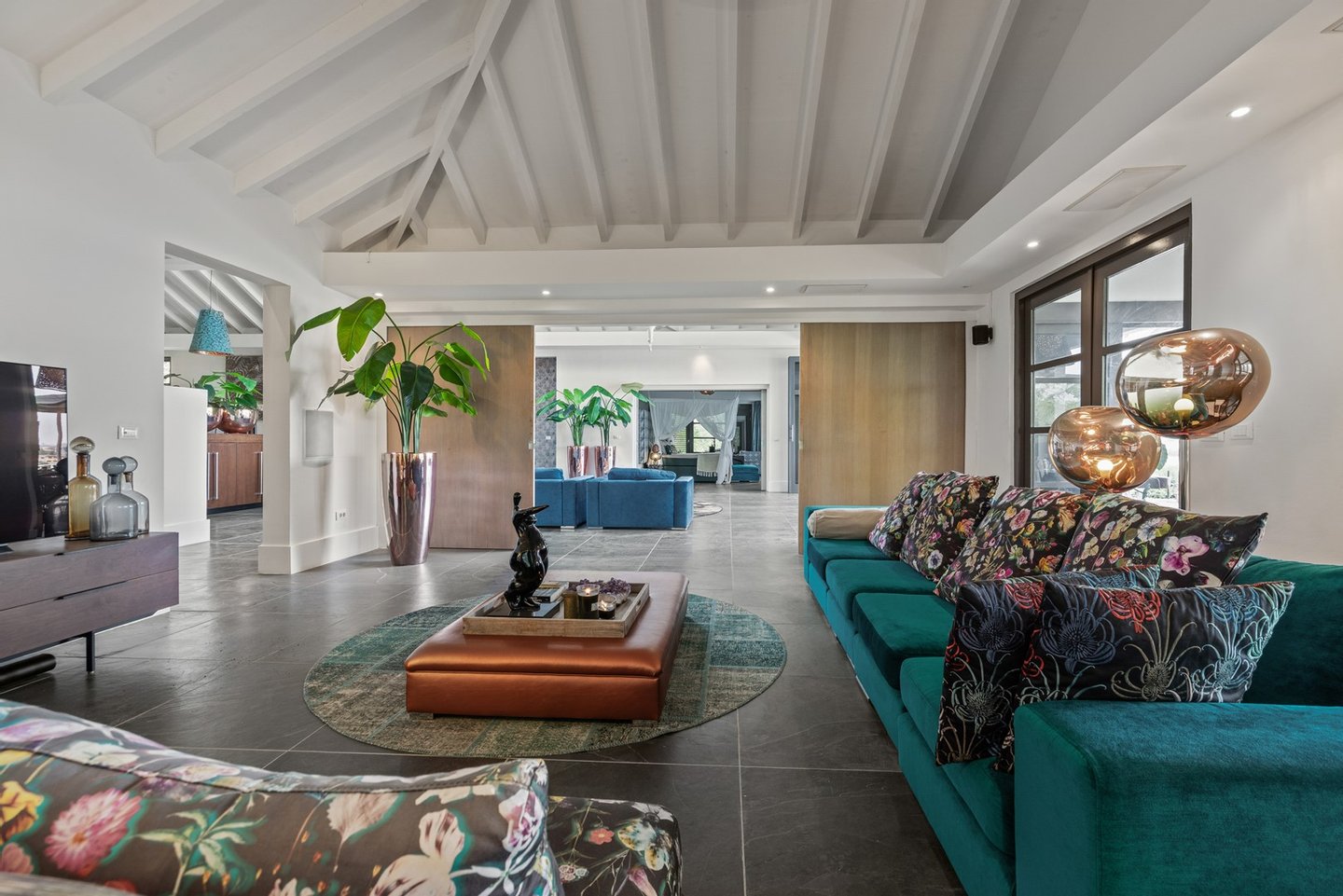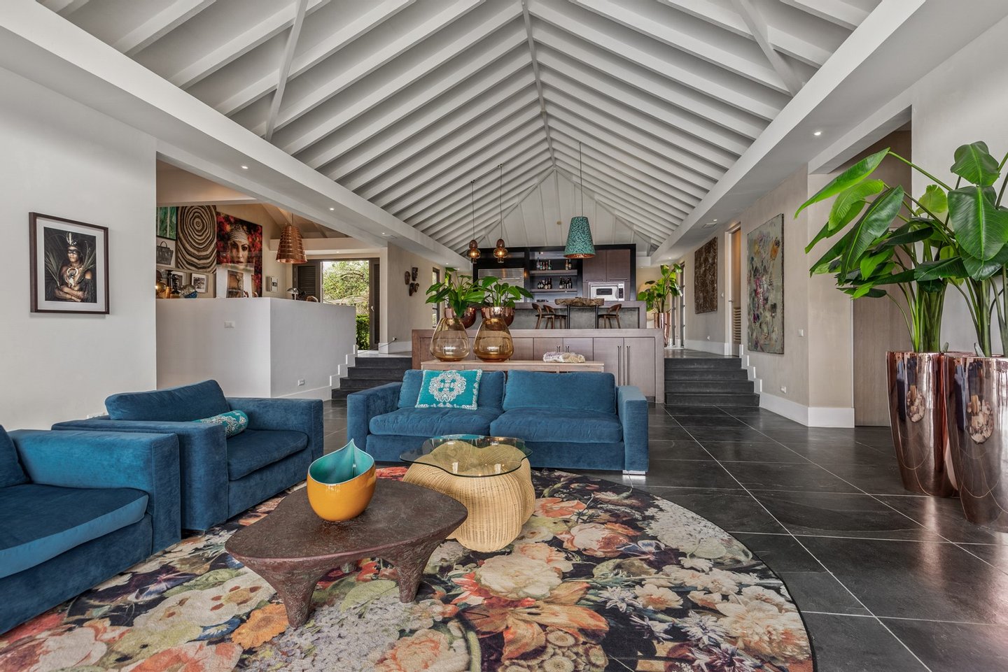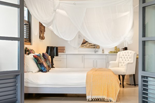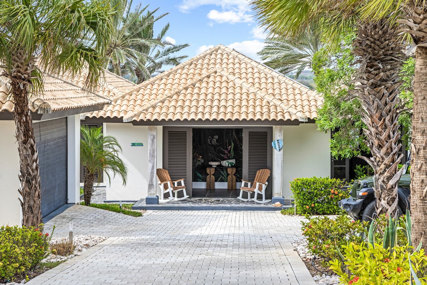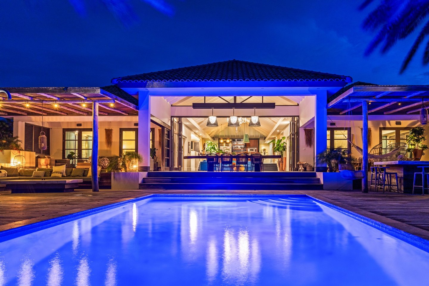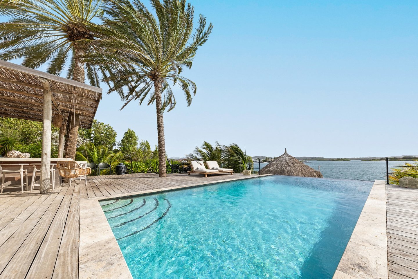 Diese opulente Villa befindet sich im geschlossenen Resort Santa Barbara Plantation-Curaçao am Ufer des Spanish Water. Der Privatstrand und das Dock sind nicht nur eine willkommene Ergänzung, sondern auch eine einzigartige Ergänzung zu den luxuriösen Wohneinrichtungen. Seru Boca Estate ist eine exklusive Wohnanlage in einer der sichersten Lagen auf Curaçao, die professionelle Sicherheit bietet, auch auf dem Wasser. Wassersportarten sind in dieser Region leicht zugänglich, was sie neben dem Golfen zu einem beliebten Zeitvertreib macht. Das ist keine Überraschung, denn das Resort beherbergt den Pete Dye Old Quarry Golf Course, der als der schönste Golfplatz der Karibik gefeiert wurde. Diese Villa ist ein wahres Juwel, in dem alle Ihre Wohnträume wahr werden. Es garantiert vollkommene Ruhe, Entspannung und Genuss. Der herrschaftliche, exklusive Charakter der Villa wird durch ihre symmetrische Architektur unterstrichen. In dem Moment, in dem Sie den pulsierenden Eingang betreten, ist es offensichtlich, dass Raum, Ruhe, Gemütlichkeit und Farbe perfekt miteinander harmonieren. Die Wand im Foyer ist mit bunten Dschungeltapeten geschmückt, die Möbel und Accessoires in den anderen Räumen sind in verschiedenen warmen Tönen gestaltet. Der Kontrast mit der ruhigen Basis aus hellen Farbtönen schafft ein ruhiges und komfortables Ambiente. Überall in der Villa werden Sie die Schieferfliesenböden, die weiß verputzten Wände und die passenden Holztüren bemerken. Dieses atemberaubende Haus verfügt außerdem über 6 Schlafzimmer, 5 Badezimmer, eine Palapa und eine Außenküche. Dank der Verwendung hochwertiger Materialien, verspielter Architektur, luxuriöser Ausstattung und zahlreicher nachhaltiger Ausstattungsmerkmale harmoniert diese sensationelle Villa perfekt mit ihrer Umgebung. Mit allen Einrichtungen in Reichweite ist dies ein privates Paradies an einem der schönsten Orte von Curaçao. Wenn Sie jemals einen Tapetenwechsel erleben möchten, bietet Santa Barbara eine Fülle von Sport- und Freizeitaktivitäten, darunter ein exklusives Restaurant mit verlockenden Gerichten. Aus dem Leben wie ein König in Frankreich ist geworden: Leben wie ein König auf Curaçao! Baustatus/Grundstück Merkmale: Baujahr: 2020 Baustil: Modern mit Split-Level-Elementen Wohnfläche: 769 m² Grundstücksfläche: 2820 m² Dach: Südeuropäische Dachziegel und Sonnenkollektoren Holzfensterrahmen 6 Schlafzimmer 5 Badezimmer 1 Gäste-WC Großer Infinity-Pool Privatstrand und Dock Außenküche Palapa Technische und praktische Details: 43 Sonnenkollektoren High-End-Geräte Home-Soundsystem Deckenventilatoren Eingebaute Beleuchtung Sicherheitssystem Moskitovernebelungssystem Renovierungen: Sowohl die Innen- als auch die Außenpflege sind auf dem neuesten Stand. In den letzten Jahren wurde die Villa in Etappen renoviert. Die Terrasse, die ursprünglich mehrere Ebenen hatte und auf der sich der Pool einen Meter höher befand, wurde eingeebnet. Die hölzernen Terrassenbalken wurden durch Beton ersetzt, und der Pool erhielt eine Verjüngungskur. Der Hauswirtschaftsraum wurde modernisiert und die Küchenwand wurde versetzt, um mehr praktischen Platz zu schaffen. Der Bar- und Loungebereich erhielt ein Dach. Darüber hinaus wurden die Sanitär- und Elektroinstallationen modernisiert und ein Teil des felsigen Bereichs in einen Privatstrand umgewandelt. Der Standort und Witterungseinflüsse wie Sonne, Schatten und Wind wurden bei der Sanierung sorgfältig berücksichtigt. Die gesamte Villa und das Grundstück sind auf dem neuesten Stand. Eingang: Decke mit kunstvollen Linien Wenn Sie durch das elektrische Tor fahren, passieren Sie eine von Palmen gesäumte, gepflasterte Einfahrt. Willkommen in den niederländischen Tropen! Auf der linken Seite befindet sich eine Garage mit Platz für zwei Autos und einen Golfwagen, während auf der anderen Seite des Weges zwei weitere Autos unter einem Schattentuch geparkt werden können. Die erste von vielen Terrassen befindet sich links von der Eingangsveranda. Beim Betreten der Villa befinden Sie sich auf der Veranda, wo große Fenster den Raum mit Licht durchfluten. Die markante Deckenkonstruktion, die sich über das gesamte Stockwerk bis zum Dach des Hauses erstreckt, sticht sofort ins Auge, mit einem kunstvollen Zusammenspiel von Holzbalken und -paneelen. Jeder Raum wird praktisch genutzt: Eine große Wand, die mit leuchtenden Dschungeltapeten bedeckt ist, schafft sofort ein heimeliges Gefühl. Über das Foyer gelangt man über Flure links und rechts der Tropenwand in den Wohnbereich und die luxuriöse offene Küche. Wenn Sie vom Foyer aus durch den linken Flur gehen, finden Sie auf der linken Seite einen geräumigen Abstellraum mit viel Stauraum und Platz für eine Waschmaschine und einen Trockner. Etwas weiter öffnet sich eine Nische mit zwei Türen, die zu einem Toilettenraum (links) mit hängender Toilette, Urinal und Waschbecken führt. Hinter der rechten Tür führt eine kleine Treppe zu einem der schönen Schlafzimmer mit eigenem Bad. En-suite Bathroom: Ein ruhiger Blick aus der Badewanne Im überraschend großen en-suite Badezimmer auf der Wohnetage, das von Deckenstrahlern beleuchtet wird, können Sie sich in ultimativer Entspannung und Selbstfürsorge verwöhnen. Das Badezimmer verfügt über eine freistehende Wand mit Doppelwaschbecken und einem Waschtischunterschrank. Hinter der Wand befindet sich ein begehbarer Toilettenbereich mit Hängetoilette und Bidet sowie ein begehbarer Duschbereich. Der tropische Garten, der durch das Fenster zu sehen ist, erinnert an ein wunderschön gerahmtes Stillleben. Sind Sie eher ein Badeliebhaber? Dieser Wunsch wird mit der schicken freistehenden Badewanne auf der Plattform erfüllt, komplett mit Wandarmatur und Sprüher. Eine lange, praktische Arbeitsplatte entlang der Wand des Raums eignet sich perfekt zum Falten von Handtüchern und Kleidung, die im extra geschlossenen Schrank gegenüber verstaut werden können. Hauptschlafzimmer:
