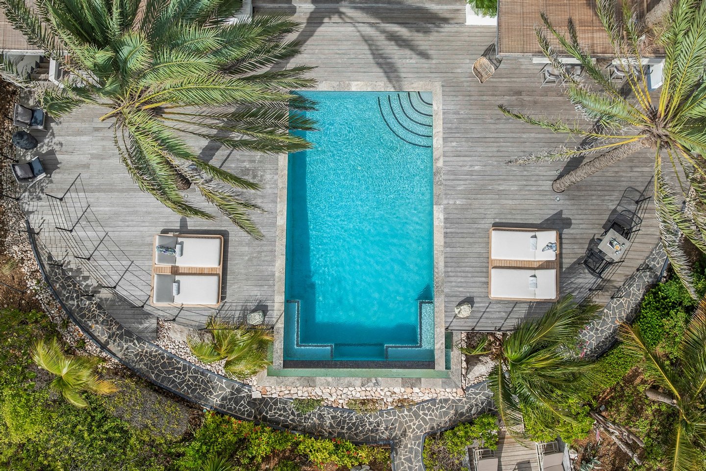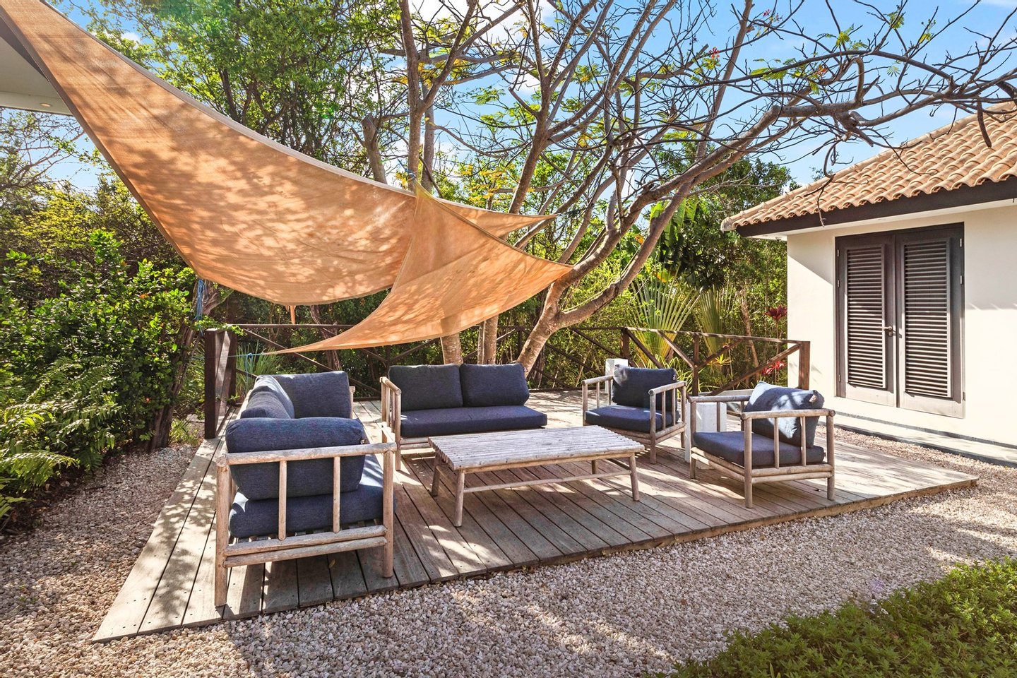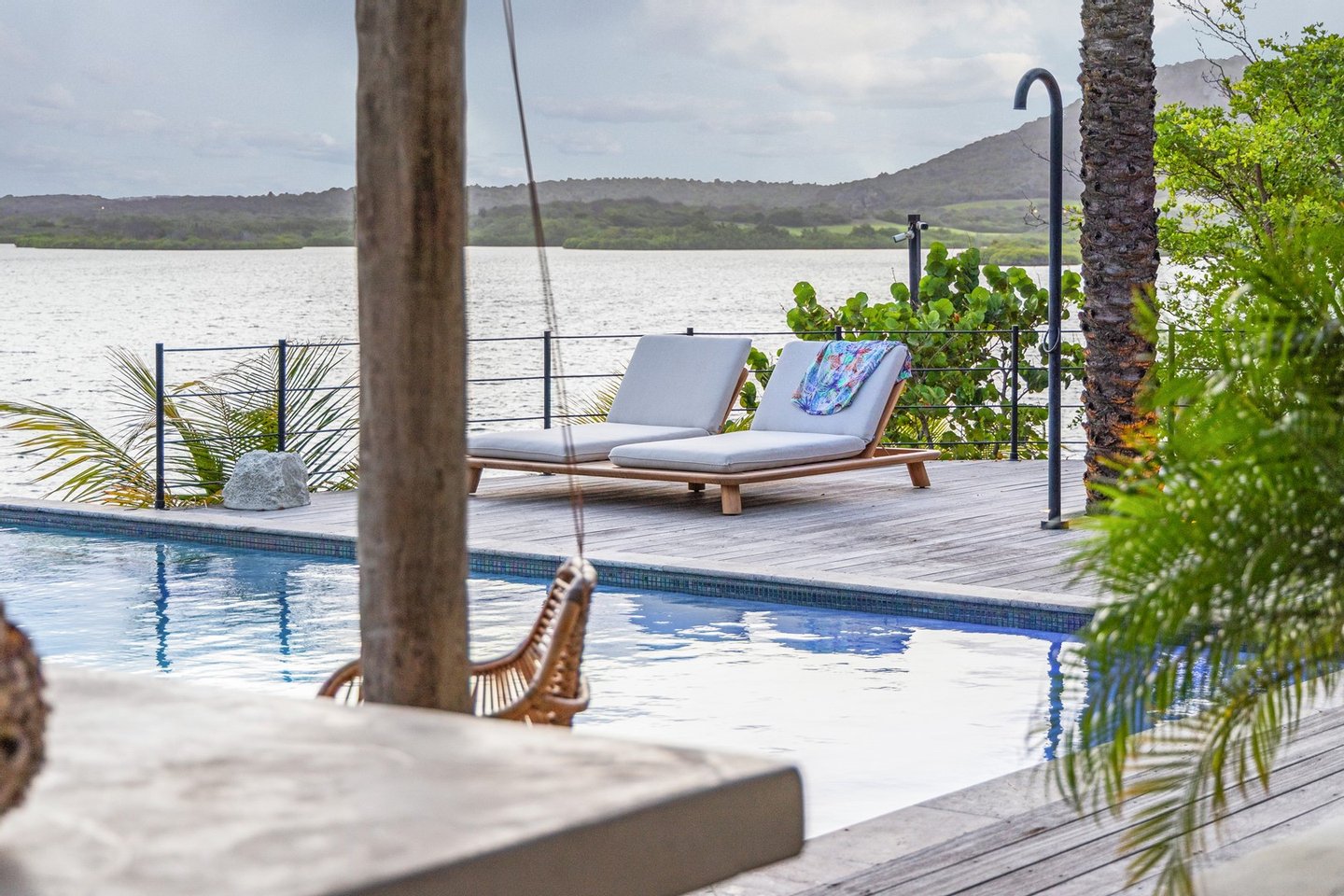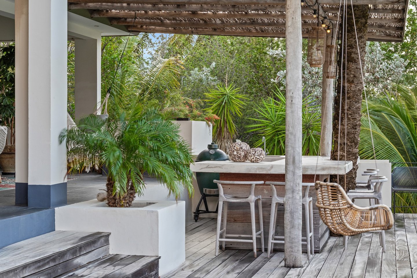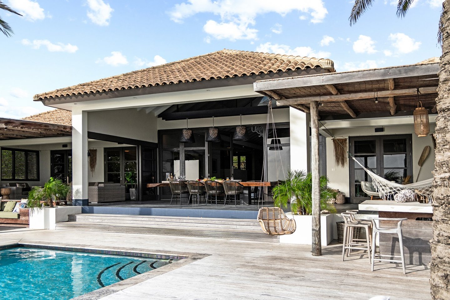 Diese opulente Villa befindet sich im geschlossenen Resort Santa Barbara Plantation-Curaçao am Ufer des Spanish Water. Der Privatstrand und das Dock sind nicht nur eine willkommene Ergänzung, sondern auch eine einzigartige Ergänzung zu den luxuriösen Wohneinrichtungen. Seru Boca Estate ist eine exklusive Wohnanlage in einer der sichersten Lagen auf Curaçao, die professionelle Sicherheit bietet, auch auf dem Wasser. Wassersportarten sind in dieser Region leicht zugänglich, was sie neben dem Golfen zu einem beliebten Zeitvertreib macht. Das ist keine Überraschung, denn das Resort beherbergt den Pete Dye Old Quarry Golf Course, der als der schönste Golfplatz der Karibik gefeiert wurde. Diese Villa ist ein wahres Juwel, in dem alle Ihre Wohnträume wahr werden. Es garantiert vollkommene Ruhe, Entspannung und Genuss. Der herrschaftliche, exklusive Charakter der Villa wird durch ihre symmetrische Architektur unterstrichen. In dem Moment, in dem Sie den pulsierenden Eingang betreten, ist es offensichtlich, dass Raum, Ruhe, Gemütlichkeit und Farbe perfekt miteinander harmonieren. Die Wand im Foyer ist mit bunten Dschungeltapeten geschmückt, die Möbel und Accessoires in den anderen Räumen sind in verschiedenen warmen Tönen gestaltet. Der Kontrast mit der ruhigen Basis aus hellen Farbtönen schafft ein ruhiges und komfortables Ambiente. Überall in der Villa werden Sie die Schieferfliesenböden, die weiß verputzten Wände und die passenden Holztüren bemerken. Dieses atemberaubende Haus verfügt außerdem über 6 Schlafzimmer, 5 Badezimmer, eine Palapa und eine Außenküche. Dank der Verwendung hochwertiger Materialien, verspielter Architektur, luxuriöser Ausstattung und zahlreicher nachhaltiger Ausstattungsmerkmale harmoniert diese sensationelle Villa perfekt mit ihrer Umgebung. Mit allen Einrichtungen in Reichweite ist dies ein privates Paradies an einem der schönsten Orte von Curaçao. Wenn Sie jemals einen Tapetenwechsel erleben möchten, bietet Santa Barbara eine Fülle von Sport- und Freizeitaktivitäten, darunter ein exklusives Restaurant mit verlockenden Gerichten. Aus dem Leben wie ein König in Frankreich ist geworden: Leben wie ein König auf Curaçao! Baustatus/Grundstück Merkmale: Baujahr: 2020 Baustil: Modern mit Split-Level-Elementen Wohnfläche: 769 m² Grundstücksfläche: 2820 m² Dach: Südeuropäische Dachziegel und Sonnenkollektoren Holzfensterrahmen 6 Schlafzimmer 5 Badezimmer 1 Gäste-WC Großer Infinity-Pool Privatstrand und Dock Außenküche Palapa Technische und praktische Details: 43 Sonnenkollektoren High-End-Geräte Home-Soundsystem Deckenventilatoren Eingebaute Beleuchtung Sicherheitssystem Moskitovernebelungssystem Renovierungen: Sowohl die Innen- als auch die Außenpflege sind auf dem neuesten Stand. In den letzten Jahren wurde die Villa in Etappen renoviert. Die Terrasse, die ursprünglich mehrere Ebenen hatte und auf der sich der Pool einen Meter höher befand, wurde eingeebnet. Die hölzernen Terrassenbalken wurden durch Beton ersetzt, und der Pool erhielt eine Verjüngungskur. Der Hauswirtschaftsraum wurde modernisiert und die Küchenwand wurde versetzt, um mehr praktischen Platz zu schaffen. Der Bar- und Loungebereich erhielt ein Dach. Darüber hinaus wurden die Sanitär- und Elektroinstallationen modernisiert und ein Teil des felsigen Bereichs in einen Privatstrand umgewandelt. Der Standort und Witterungseinflüsse wie Sonne, Schatten und Wind wurden bei der Sanierung sorgfältig berücksichtigt. Die gesamte Villa und das Grundstück sind auf dem neuesten Stand. Eingang: Decke mit kunstvollen Linien Wenn Sie durch das elektrische Tor fahren, passieren Sie eine von Palmen gesäumte, gepflasterte Einfahrt. Willkommen in den niederländischen Tropen! Auf der linken Seite befindet sich eine Garage mit Platz für zwei Autos und einen Golfwagen, während auf der anderen Seite des Weges zwei weitere Autos unter einem Schattentuch geparkt werden können. Die erste von vielen Terrassen befindet sich links von der Eingangsveranda. Beim Betreten der Villa befinden Sie sich auf der Veranda, wo große Fenster den Raum mit Licht durchfluten. Die markante Deckenkonstruktion, die sich über das gesamte Stockwerk bis zum Dach des Hauses erstreckt, sticht sofort ins Auge, mit einem kunstvollen Zusammenspiel von Holzbalken und -paneelen. Jeder Raum wird praktisch genutzt: Eine große Wand, die mit leuchtenden Dschungeltapeten bedeckt ist, schafft sofort ein heimeliges Gefühl. Über das Foyer gelangt man über Flure links und rechts der Tropenwand in den Wohnbereich und die luxuriöse offene Küche. Wenn Sie vom Foyer aus durch den linken Flur gehen, finden Sie auf der linken Seite einen geräumigen Abstellraum mit viel Stauraum und Platz für eine Waschmaschine und einen Trockner. Etwas weiter öffnet sich eine Nische mit zwei Türen, die zu einem Toilettenraum (links) mit hängender Toilette, Urinal und Waschbecken führt. Hinter der rechten Tür führt eine kleine Treppe zu einem der schönen Schlafzimmer mit eigenem Bad. En-suite Bathroom: Ein ruhiger Blick aus der Badewanne Im überraschend großen en-suite Badezimmer auf der Wohnetage, das von Deckenstrahlern beleuchtet wird, können Sie sich in ultimativer Entspannung und Selbstfürsorge verwöhnen. Das Badezimmer verfügt über eine freistehende Wand mit Doppelwaschbecken und einem Waschtischunterschrank. Hinter der Wand befindet sich ein begehbarer Toilettenbereich mit Hängetoilette und Bidet sowie ein begehbarer Duschbereich. Der tropische Garten, der durch das Fenster zu sehen ist, erinnert an ein wunderschön gerahmtes Stillleben. Sind Sie eher ein Badeliebhaber? Dieser Wunsch wird mit der schicken freistehenden Badewanne auf der Plattform erfüllt, komplett mit Wandarmatur und Sprüher. Eine lange, praktische Arbeitsplatte entlang der Wand des Raums eignet sich perfekt zum Falten von Handtüchern und Kleidung, die im extra geschlossenen Schrank gegenüber verstaut werden können. Hauptschlafzimmer: