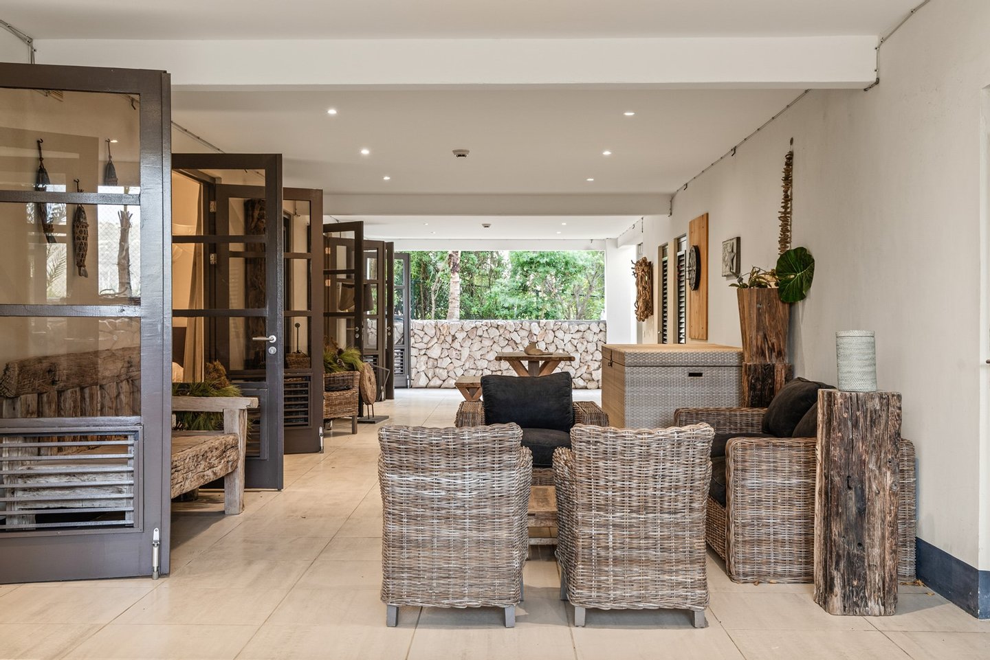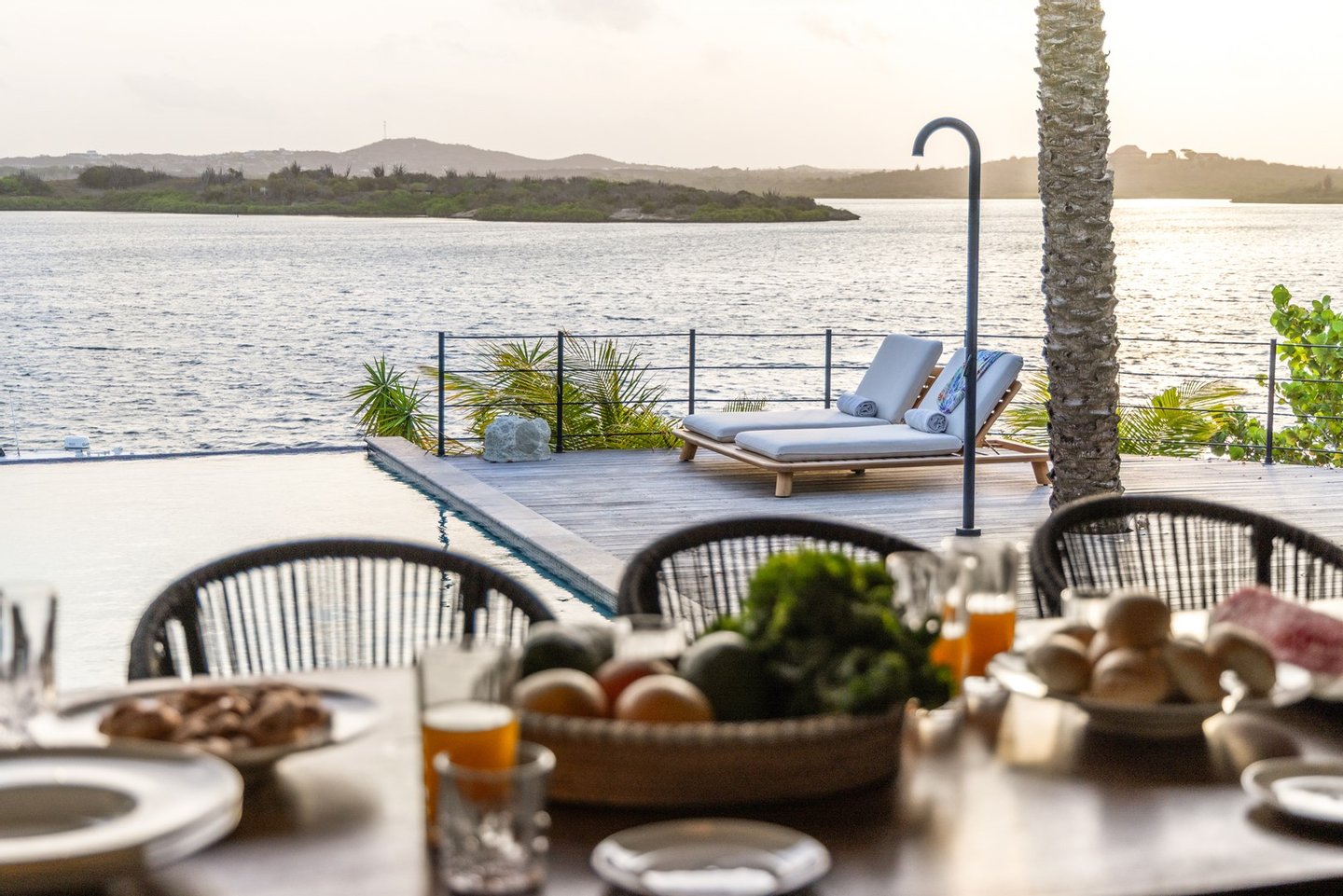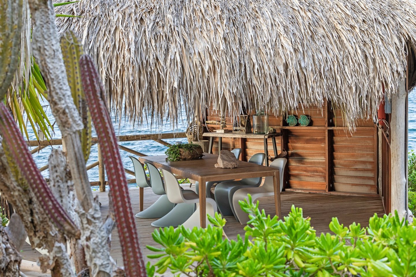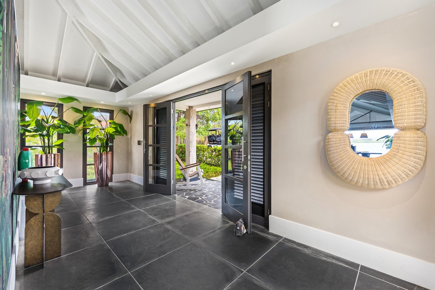 Diese opulente Villa befindet sich im geschlossenen Resort Santa Barbara Plantation-Curaçao am Ufer des Spanish Water. Der Privatstrand und das Dock sind nicht nur eine willkommene Ergänzung, sondern auch eine einzigartige Ergänzung zu den luxuriösen Wohneinrichtungen. Seru Boca Estate ist eine exklusive Wohnanlage in einer der sichersten Lagen auf Curaçao, die professionelle Sicherheit bietet, auch auf dem Wasser. Wassersportarten sind in dieser Region leicht zugänglich, was sie neben dem Golfen zu einem beliebten Zeitvertreib macht. Das ist keine Überraschung, denn das Resort beherbergt den Pete Dye Old Quarry Golf Course, der als der schönste Golfplatz der Karibik gefeiert wurde. Diese Villa ist ein wahres Juwel, in dem alle Ihre Wohnträume wahr werden. Es garantiert vollkommene Ruhe, Entspannung und Genuss. Der herrschaftliche, exklusive Charakter der Villa wird durch ihre symmetrische Architektur unterstrichen. In dem Moment, in dem Sie den pulsierenden Eingang betreten, ist es offensichtlich, dass Raum, Ruhe, Gemütlichkeit und Farbe perfekt miteinander harmonieren. Die Wand im Foyer ist mit bunten Dschungeltapeten geschmückt, die Möbel und Accessoires in den anderen Räumen sind in verschiedenen warmen Tönen gestaltet. Der Kontrast mit der ruhigen Basis aus hellen Farbtönen schafft ein ruhiges und komfortables Ambiente. Überall in der Villa werden Sie die Schieferfliesenböden, die weiß verputzten Wände und die passenden Holztüren bemerken. Dieses atemberaubende Haus verfügt außerdem über 6 Schlafzimmer, 5 Badezimmer, eine Palapa und eine Außenküche. Dank der Verwendung hochwertiger Materialien, verspielter Architektur, luxuriöser Ausstattung und zahlreicher nachhaltiger Ausstattungsmerkmale harmoniert diese sensationelle Villa perfekt mit ihrer Umgebung. Mit allen Einrichtungen in Reichweite ist dies ein privates Paradies an einem der schönsten Orte von Curaçao. Wenn Sie jemals einen Tapetenwechsel erleben möchten, bietet Santa Barbara eine Fülle von Sport- und Freizeitaktivitäten, darunter ein exklusives Restaurant mit verlockenden Gerichten. Aus dem Leben wie ein König in Frankreich ist geworden: Leben wie ein König auf Curaçao! Baustatus/Grundstück Merkmale: Baujahr: 2020 Baustil: Modern mit Split-Level-Elementen Wohnfläche: 769 m² Grundstücksfläche: 2820 m² Dach: Südeuropäische Dachziegel und Sonnenkollektoren Holzfensterrahmen 6 Schlafzimmer 5 Badezimmer 1 Gäste-WC Großer Infinity-Pool Privatstrand und Dock Außenküche Palapa Technische und praktische Details: 43 Sonnenkollektoren High-End-Geräte Home-Soundsystem Deckenventilatoren Eingebaute Beleuchtung Sicherheitssystem Moskitovernebelungssystem Renovierungen: Sowohl die Innen- als auch die Außenpflege sind auf dem neuesten Stand. In den letzten Jahren wurde die Villa in Etappen renoviert. Die Terrasse, die ursprünglich mehrere Ebenen hatte und auf der sich der Pool einen Meter höher befand, wurde eingeebnet. Die hölzernen Terrassenbalken wurden durch Beton ersetzt, und der Pool erhielt eine Verjüngungskur. Der Hauswirtschaftsraum wurde modernisiert und die Küchenwand wurde versetzt, um mehr praktischen Platz zu schaffen. Der Bar- und Loungebereich erhielt ein Dach. Darüber hinaus wurden die Sanitär- und Elektroinstallationen modernisiert und ein Teil des felsigen Bereichs in einen Privatstrand umgewandelt. Der Standort und Witterungseinflüsse wie Sonne, Schatten und Wind wurden bei der Sanierung sorgfältig berücksichtigt. Die gesamte Villa und das Grundstück sind auf dem neuesten Stand. Eingang: Decke mit kunstvollen Linien Wenn Sie durch das elektrische Tor fahren, passieren Sie eine von Palmen gesäumte, gepflasterte Einfahrt. Willkommen in den niederländischen Tropen! Auf der linken Seite befindet sich eine Garage mit Platz für zwei Autos und einen Golfwagen, während auf der anderen Seite des Weges zwei weitere Autos unter einem Schattentuch geparkt werden können. Die erste von vielen Terrassen befindet sich links von der Eingangsveranda. Beim Betreten der Villa befinden Sie sich auf der Veranda, wo große Fenster den Raum mit Licht durchfluten. Die markante Deckenkonstruktion, die sich über das gesamte Stockwerk bis zum Dach des Hauses erstreckt, sticht sofort ins Auge, mit einem kunstvollen Zusammenspiel von Holzbalken und -paneelen. Jeder Raum wird praktisch genutzt: Eine große Wand, die mit leuchtenden Dschungeltapeten bedeckt ist, schafft sofort ein heimeliges Gefühl. Über das Foyer gelangt man über Flure links und rechts der Tropenwand in den Wohnbereich und die luxuriöse offene Küche. Wenn Sie vom Foyer aus durch den linken Flur gehen, finden Sie auf der linken Seite einen geräumigen Abstellraum mit viel Stauraum und Platz für eine Waschmaschine und einen Trockner. Etwas weiter öffnet sich eine Nische mit zwei Türen, die zu einem Toilettenraum (links) mit hängender Toilette, Urinal und Waschbecken führt. Hinter der rechten Tür führt eine kleine Treppe zu einem der schönen Schlafzimmer mit eigenem Bad. En-suite Bathroom: Ein ruhiger Blick aus der Badewanne Im überraschend großen en-suite Badezimmer auf der Wohnetage, das von Deckenstrahlern beleuchtet wird, können Sie sich in ultimativer Entspannung und Selbstfürsorge verwöhnen. Das Badezimmer verfügt über eine freistehende Wand mit Doppelwaschbecken und einem Waschtischunterschrank. Hinter der Wand befindet sich ein begehbarer Toilettenbereich mit Hängetoilette und Bidet sowie ein begehbarer Duschbereich. Der tropische Garten, der durch das Fenster zu sehen ist, erinnert an ein wunderschön gerahmtes Stillleben. Sind Sie eher ein Badeliebhaber? Dieser Wunsch wird mit der schicken freistehenden Badewanne auf der Plattform erfüllt, komplett mit Wandarmatur und Sprüher. Eine lange, praktische Arbeitsplatte entlang der Wand des Raums eignet sich perfekt zum Falten von Handtüchern und Kleidung, die im extra geschlossenen Schrank gegenüber verstaut werden können. Hauptschlafzimmer:
