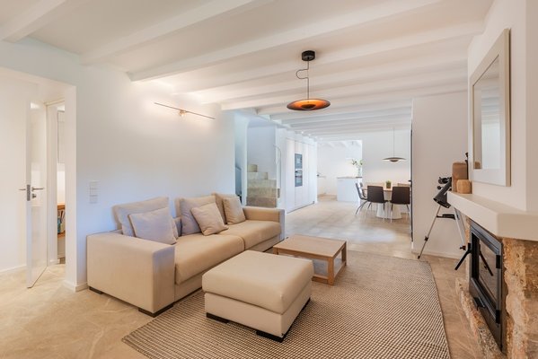 Das Haus ist komplett freistehend und geschmackvoll renoviert und verfügt über vier geräumige Schlafzimmer und zwei moderne Badezimmer. Auf zwei Ebenen verteilt, beherbergt das Erdgeschoss ein Doppelschlafzimmer und ein Duschbad sowie einen hellen, offenen Wohnbereich. Hier öffnen ein gemütlicher Kamin, ein eleganter Essbereich und eine schlichte, moderne Küche direkt auf eine großzügige Außenterrasse, die sich perfekt für gesellige Anlässe oder einfach zum Genießen des mediterranen Lebensstils eignet.
