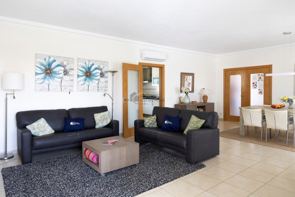 Großes und helles Wohnzimmer mit direktem Zugang zum Garten und Freizeitbereich.