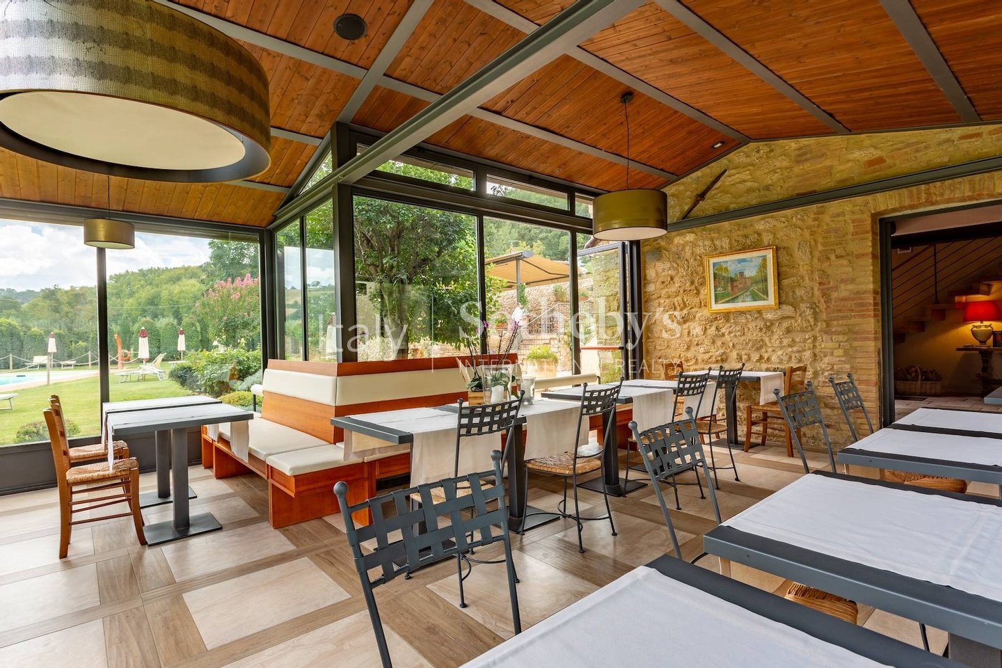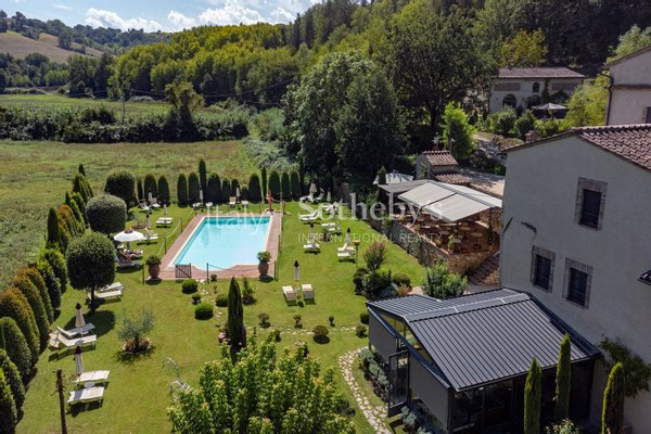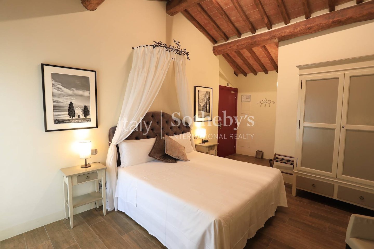Mit einer Fläche von etwa 600 m², verteilt auf zwei Etagen, bietet das Hotel 16 einzigartige Zimmer, die jedes durch authentische Details wie freiliegende Holzbalken, Terrakottaböden und einen atemberaubenden Blick auf die grünen Hügel der Toskana bestechen. Die Atmosphäre vermittelt eine exklusive Gastfreundschaft, mit eleganten und funktionalen Möbeln, die einen tadellosen Komfort bieten. Auch das Außenbereich ist ebenso faszinierend: ein 14x7 m großer Pool, umgeben von gepflegten Gärten, eine großzügige überdachte Terrasse und 4,6 Hektar landwirtschaftlich genutztes Land, das das Anwesen umgibt. Die Immobilie ist mit einer professionellen Küche und einem Frühstücksraum mit großen Fenstern ausgestattet, die einen herrlichen Blick auf die Gärten und den Pool bieten. Ein raffinierter Lounge-Bereich, technische Räume und eine Empfangshalle vervollständigen die Immobilie und gewährleisten einen erstklassigen Service. Zudem stellt die Baugenehmigung für ein neues Gebäude von 100 m², das für ein Spa, Konferenzräume oder andere Einrichtungen genutzt werden kann, eine einzigartige Erweiterungsmöglichkeit in einem Gebiet dar, in dem die städtebaulichen Vorschriften besonders streng sind.