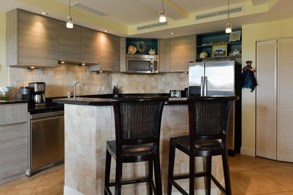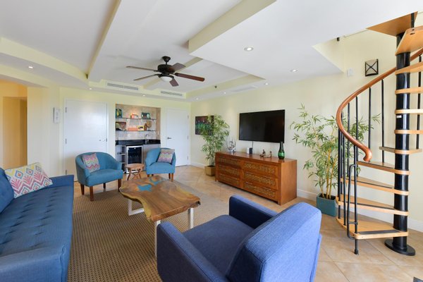 Geräumiges und elegantes Interieur Dieses zweistöckige Penthouse erstreckt sich über 4.000 Quadratmeter, einschließlich einer 1.500 Quadratfuß großen privaten Terrasse. Die offene Hauptebene verfügt über eine komplett renovierte Gourmetküche, die mit modernen Geräten, eleganten Arbeitsplatten und viel Stauraum ausgestattet ist. Der Ess- und Wohnbereich gehen nahtlos ineinander über, ergänzt durch eine Wet-Bar und einen Weinkühlschrank, was ihn perfekt für die Bewirtung macht.