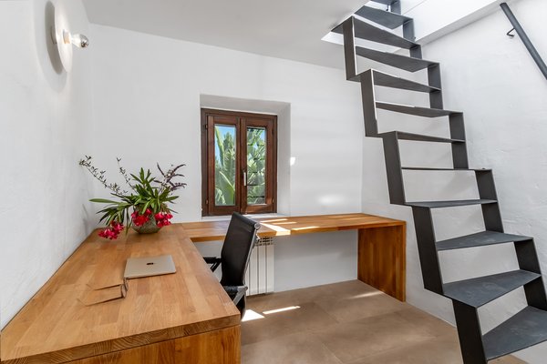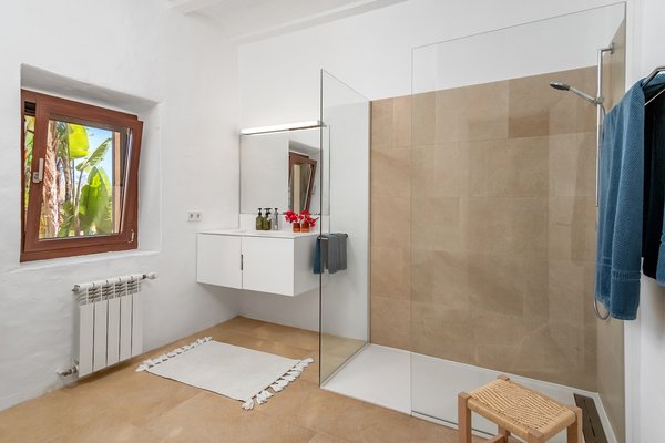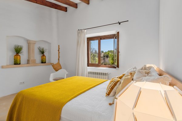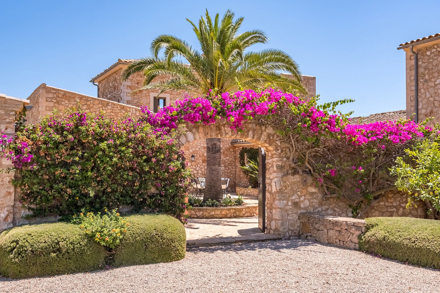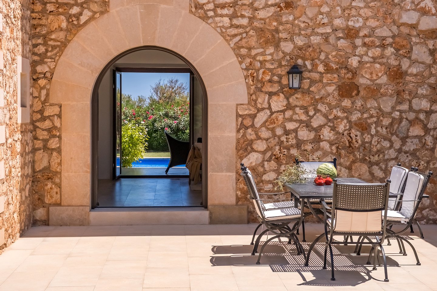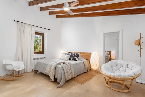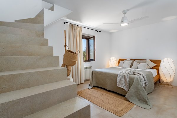 Von außen zeigt sich die Finca in traditionellem Naturstein, während ein authentischer Patio mit mediterranen Pflanzen Sie willkommen heißt. Der Eingangsbereich bietet eine gemütliche Sitzgelegenheit und einen Kamin, der in die verschiedenen Teile des Hauses führt. Zur Linken finden Sie eine großzügige Küche und einen Essbereich, unterstrichen von einem malerischen Gewölbe aus Mares Steinen. Angrenzend liegt ein großes Schlafzimmer mit Ankleide und Bad en Suite, das direkten Zugang zum Garten bietet.