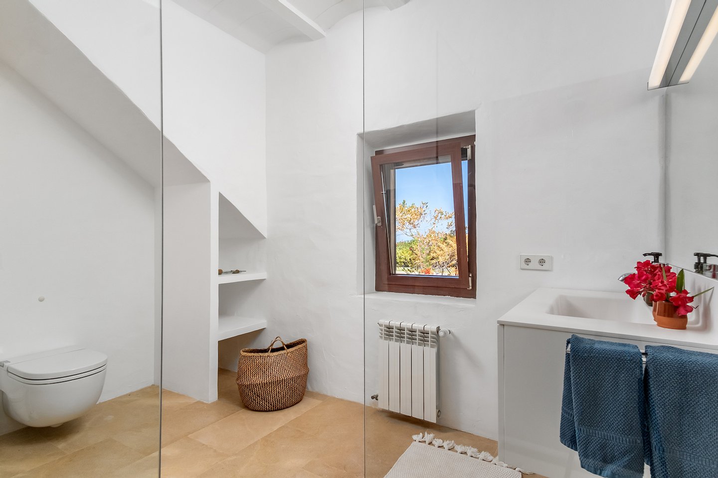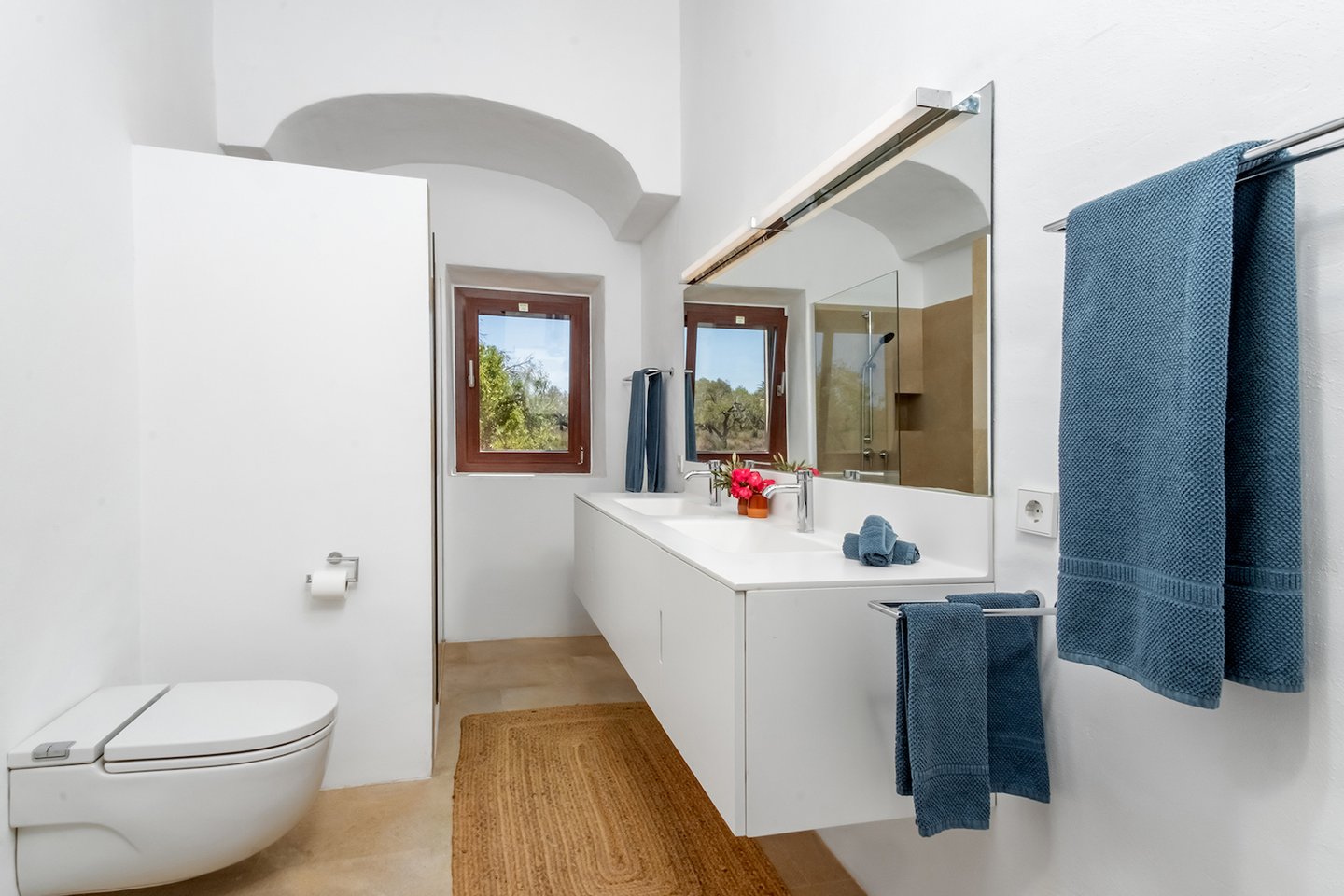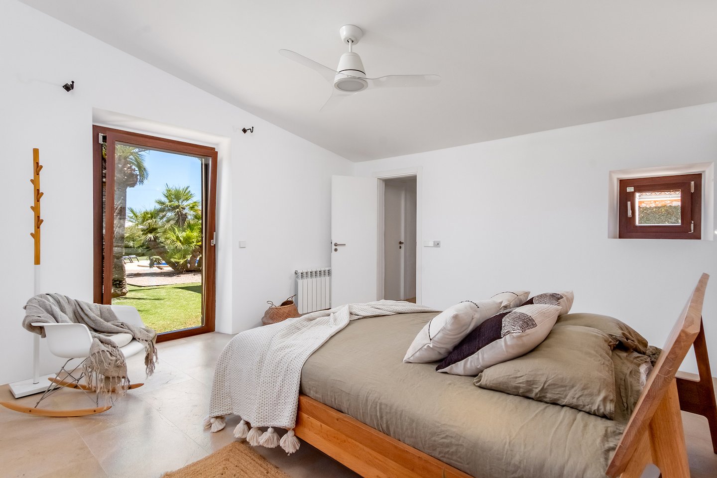 Von außen zeigt sich die Finca in traditionellem Naturstein, während ein authentischer Patio mit mediterranen Pflanzen Sie willkommen heißt. Der Eingangsbereich bietet eine gemütliche Sitzgelegenheit und einen Kamin, der in die verschiedenen Teile des Hauses führt. Zur Linken finden Sie eine großzügige Küche und einen Essbereich, unterstrichen von einem malerischen Gewölbe aus Mares Steinen. Angrenzend liegt ein großes Schlafzimmer mit Ankleide und Bad en Suite, das direkten Zugang zum Garten bietet.