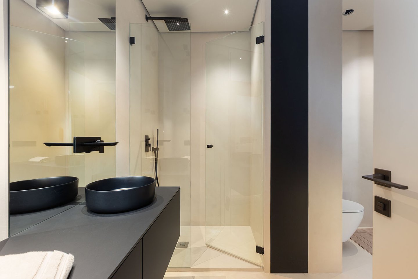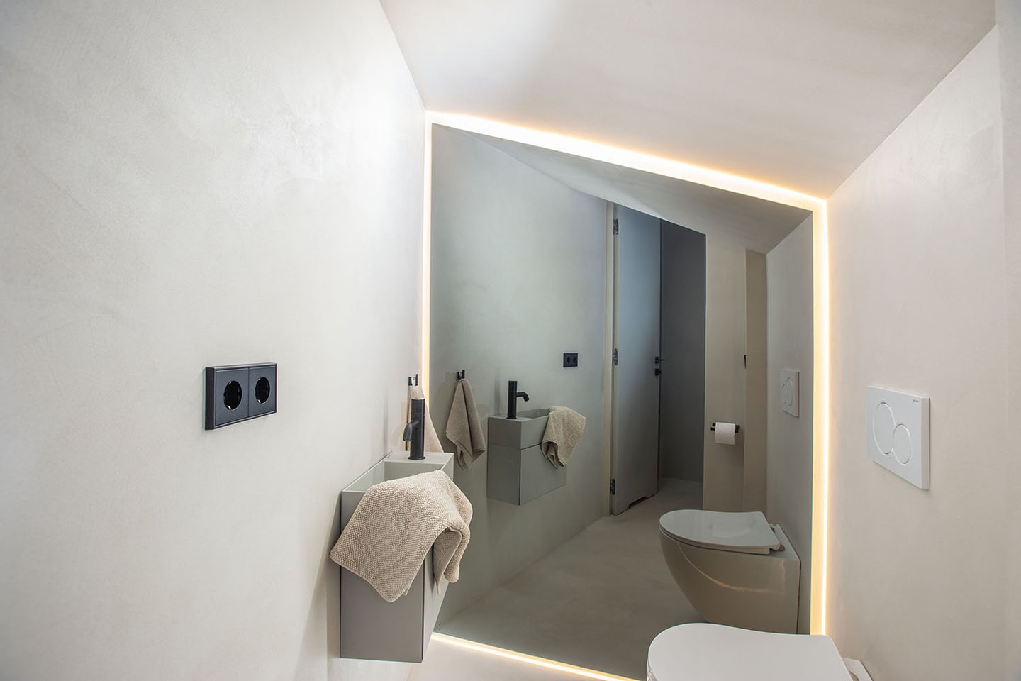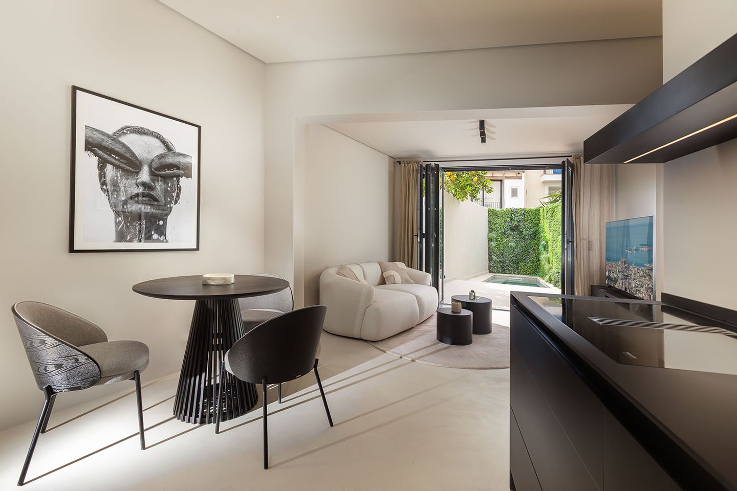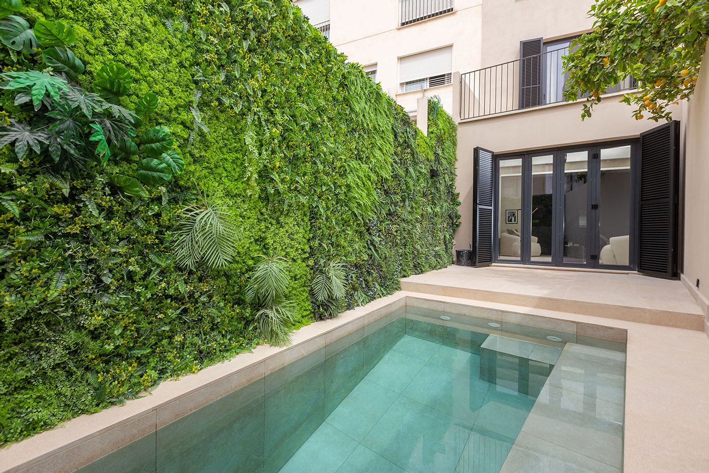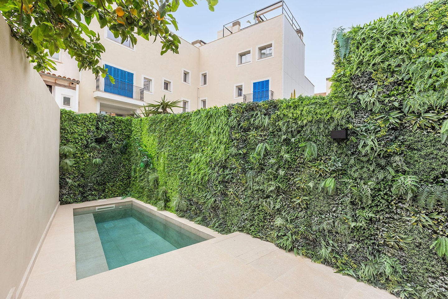 Ein kleiner Pool mit stilvollem Chill-out-Bereich, eingefasst von hochwertigen, immergrünen Mauern, sowie drei Terrassen – darunter eine großzügige Dachterrasse – erweitern den Wohnraum nach außen und bieten zahlreiche Möglichkeiten zum Entspannen und Genießen des mediterranen Klimas.