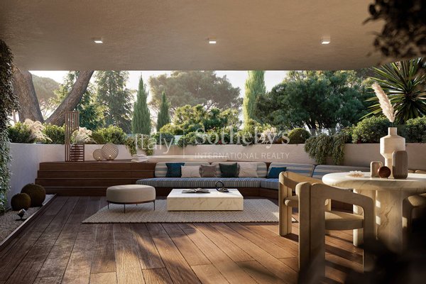 Die Wohnung erstreckt sich auf einer einzigen Etage mit 240 m² Innenfläche und Terrassen, die auf das umliegende Grün blicken.