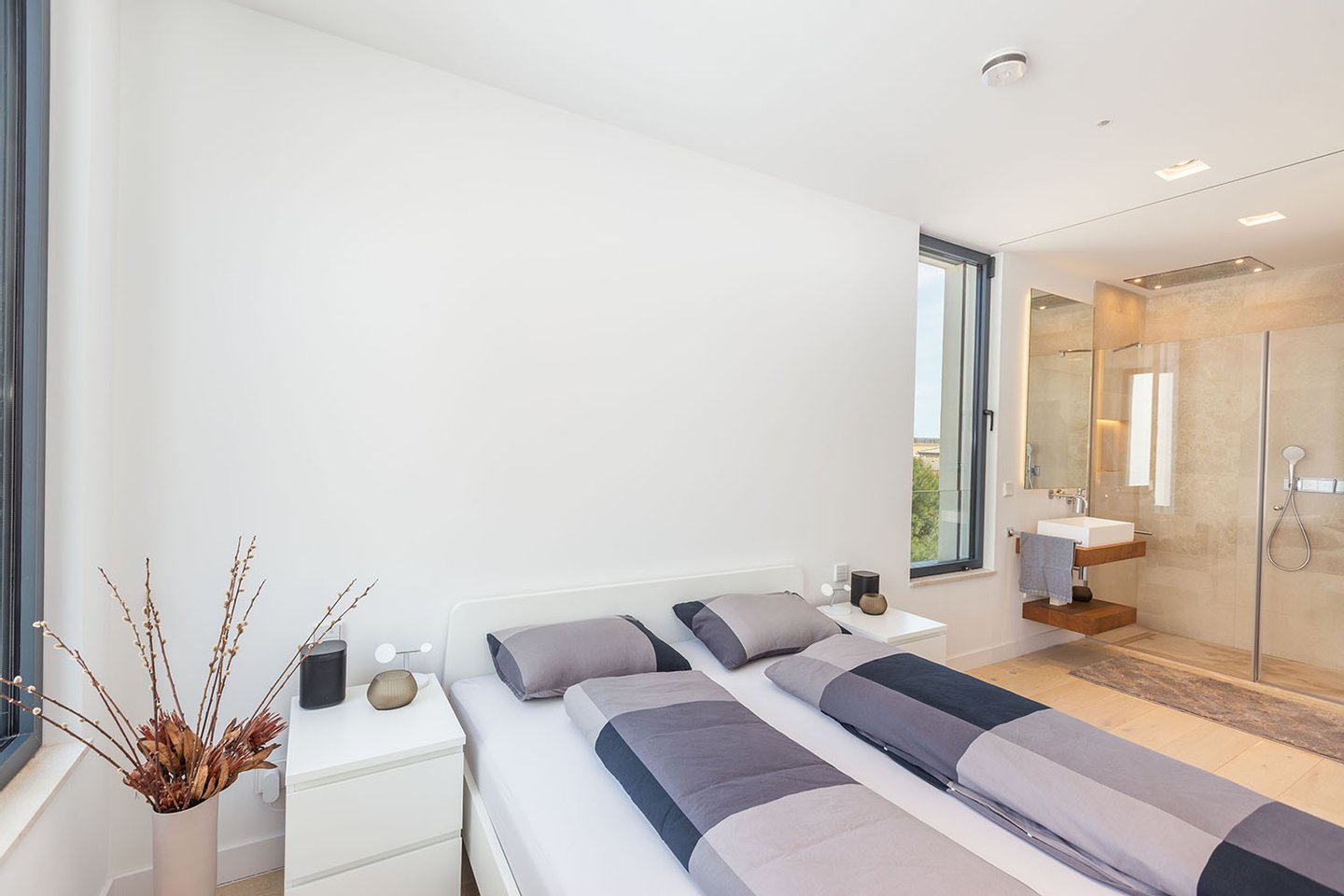 Das lichtdurchflutete Apartment überzeugt durch seine helle, offene Gestaltung und sehr hochwertige, elegante Ausstattung. Es verfügt über eine moderne Fußbodenheizung, Klimaanlage, schöne Natursteinböden sowie ein SONOS Soundsystem und ein GIRA KNX-System Smarthome-System, das höchsten Komfort und technologische Raffinesse bietet. Sorgfältig ausgewählte Details und natürliche Lichtquellen schaffen eine angenehme, stilvolle Atmosphäre.