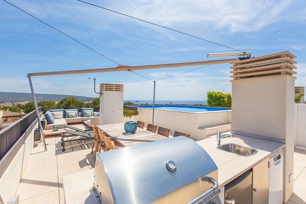 Ein absolutes Highlight ist die fast 150 m² große Dachterrasse mit Pool, Sommerküche, Außendusche, Barbecue, elektrischen Sonnensegel und einem wunderbarem Meer- und Panoramablick.