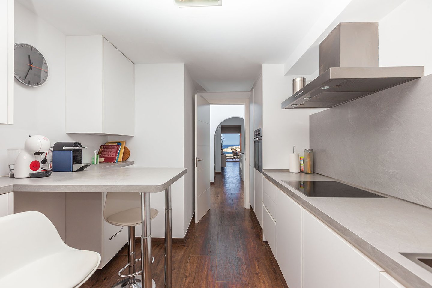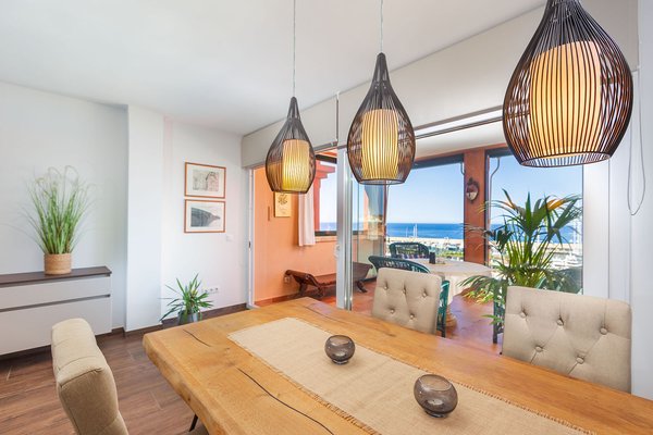 Das renovierte und modern ausgestattete Penthaus bietet zeitgemäßen Komfort wie Fußbodenheizung und Klimaanlage sowie eine mit Miele Geräten voll ausgestattete Küche. Der großzügige Wohn- und Essbereich öffnet sich zu einer 15 m² großen, überdachten Terrasse, die dank kompletter Verglasung zu allen Jahreszeiten nutzbar ist und einen wunderbaren Panoramablick über den Hafen aufs offene Meer bietet. Alle Elemente der Verglasung lassen sich flexibel öffnen. Die Ausrichtung nach Südwesten garantiert viele Sonnenstunden und sorgt für ein helles freundliches Ambiente.
