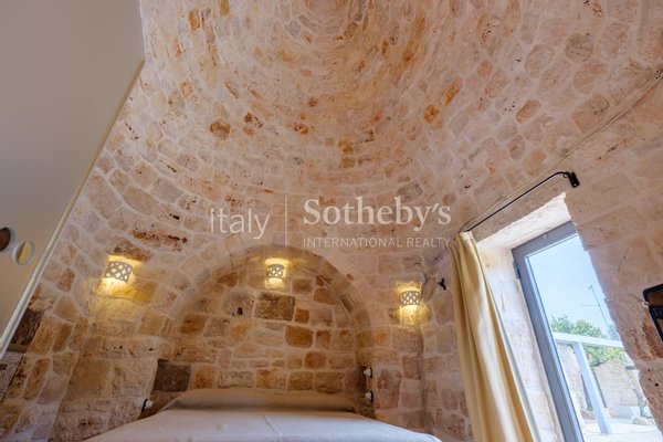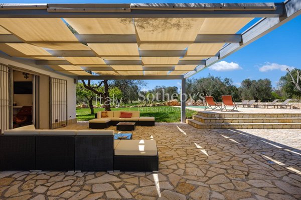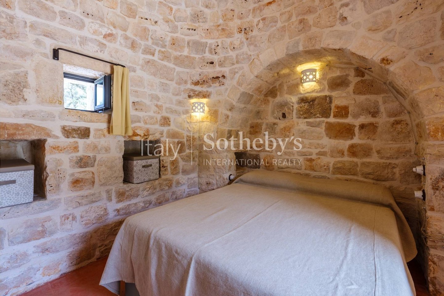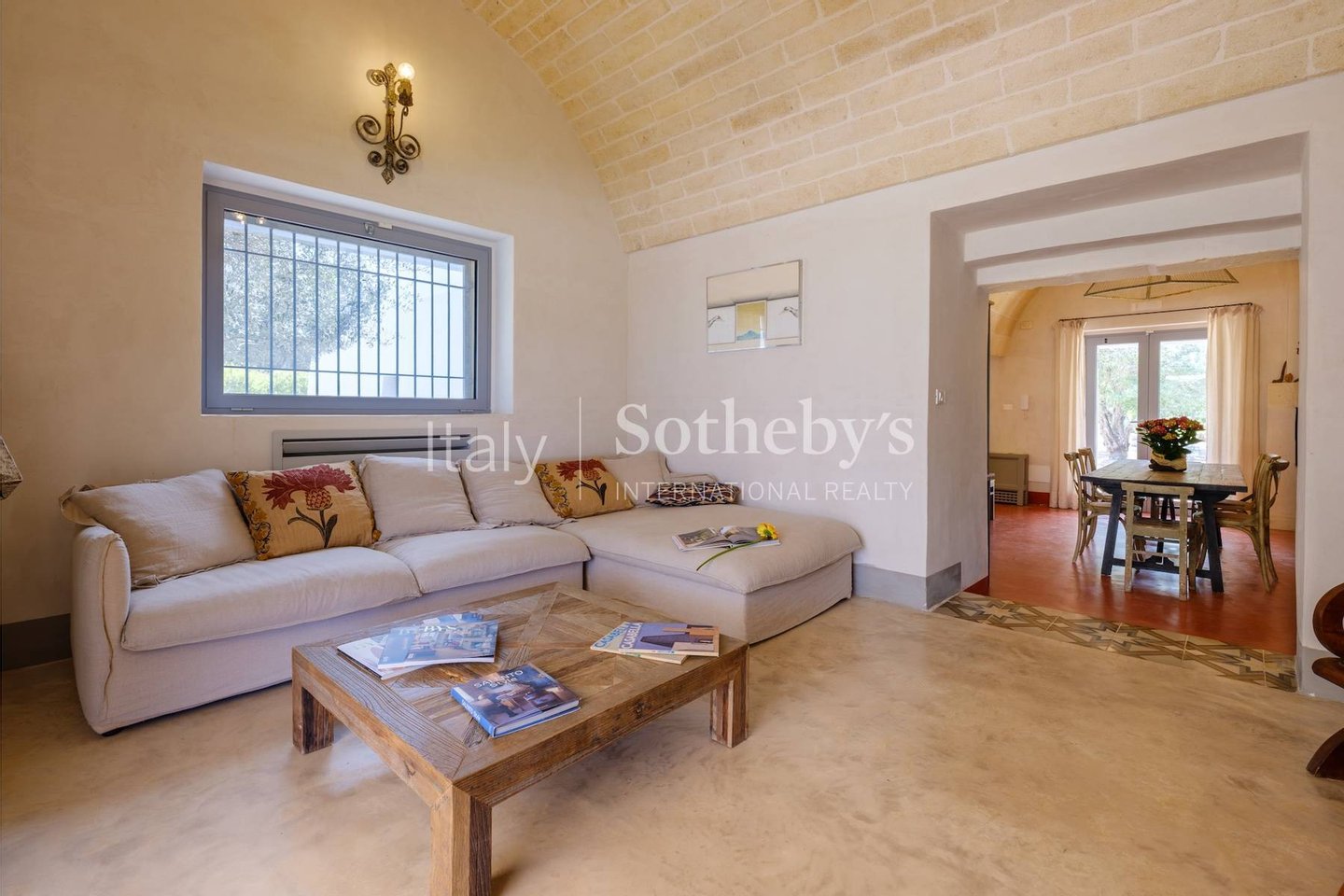 Das helle und einladende Wohnzimmer bietet einen Doppelblick: auf die vordere Veranda und auf einen Patio mit schattigem Außensitzbereich. Der Schlafbereich ist gut aufgeteilt: Auf der einen Seite das Hauptschlafzimmer mit Bad und angrenzender Küche, auf der anderen Seite zwei Doppelzimmer mit zwei Bädern. Der antike Trullo, der auf den Innenhof blickt, beherbergt ein romantisches Gästezimmer mit Bad. Auf der Rückseite befindet sich ein Außen-Wohnbereich mit Sitzgruppe, großem Tisch, Grill und Duschen, der den Erholungsbereich neben dem Pool vervollständigt. Die rustikalen und dennoch eleganten Möbel erzählen von einer sorgfältigen Aufmerksamkeit für jedes Detail.
