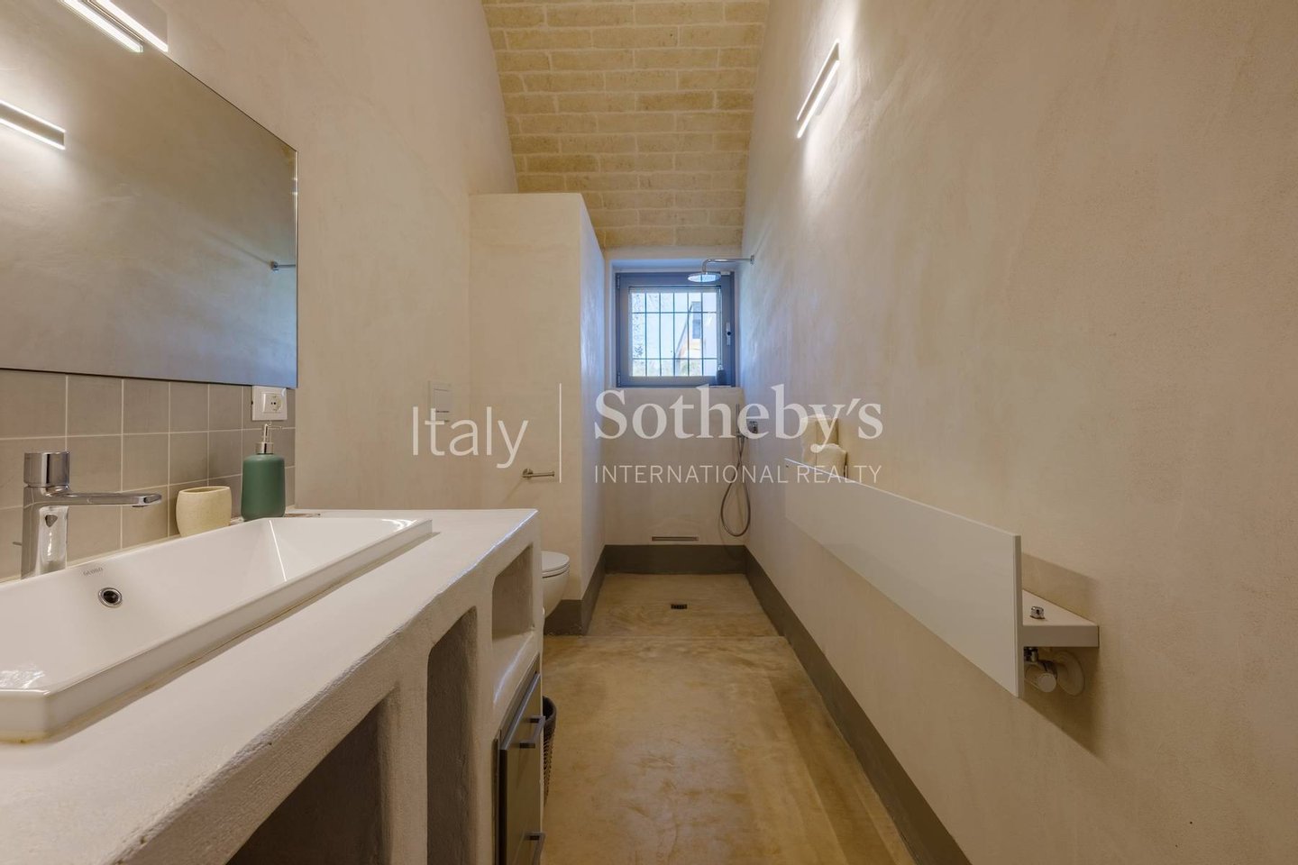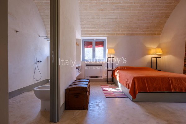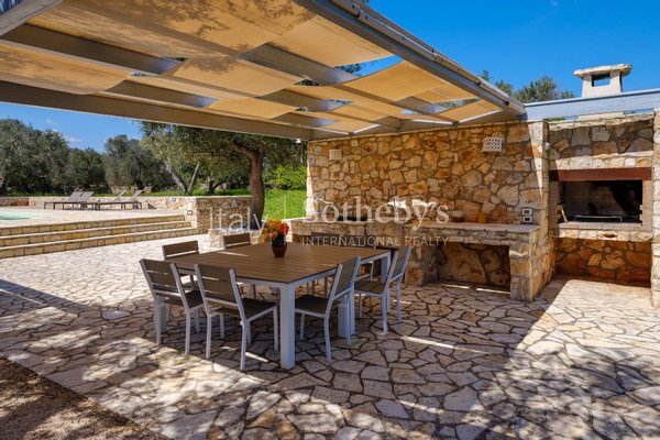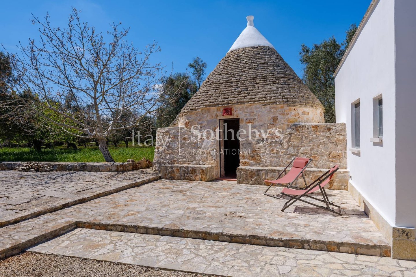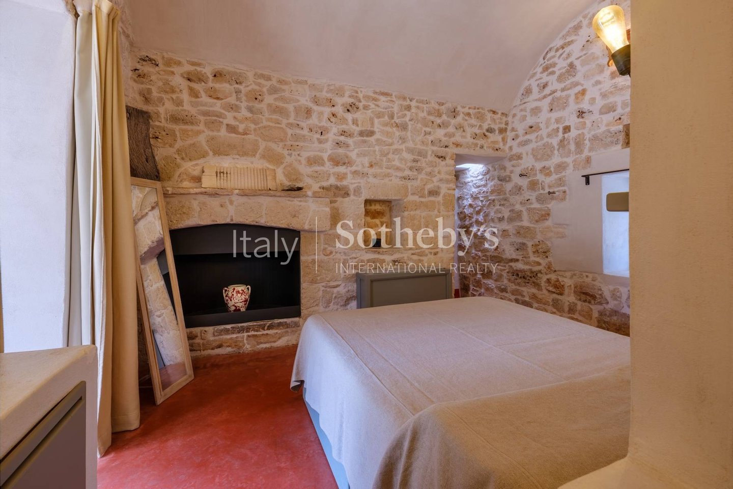 Das helle und einladende Wohnzimmer bietet einen Doppelblick: auf die vordere Veranda und auf einen Patio mit schattigem Außensitzbereich. Der Schlafbereich ist gut aufgeteilt: Auf der einen Seite das Hauptschlafzimmer mit Bad und angrenzender Küche, auf der anderen Seite zwei Doppelzimmer mit zwei Bädern. Der antike Trullo, der auf den Innenhof blickt, beherbergt ein romantisches Gästezimmer mit Bad. Auf der Rückseite befindet sich ein Außen-Wohnbereich mit Sitzgruppe, großem Tisch, Grill und Duschen, der den Erholungsbereich neben dem Pool vervollständigt. Die rustikalen und dennoch eleganten Möbel erzählen von einer sorgfältigen Aufmerksamkeit für jedes Detail.