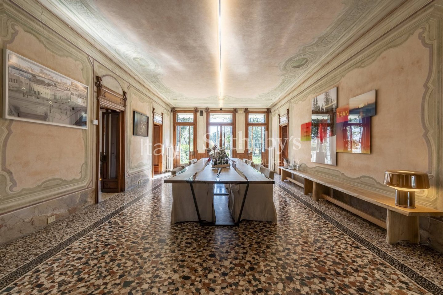 Die Villa hat ihren adeligen Charme dank sorgfältiger Restaurierungen bewahrt und bietet die klassische venezianische Ausrichtung mit großen, mit Fresken verzierten Salons und originalen Fußböden.