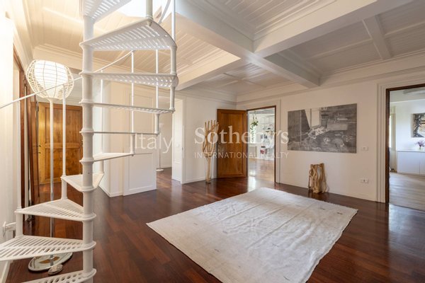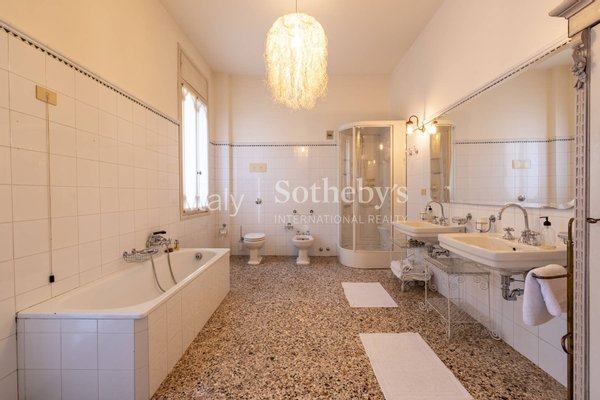 Die hellen Räume blicken auf das grüne Parkgelände und schaffen eine Wohlfühlatmosphäre, die die gesamte Villa prägt. Besonders hervorzuheben ist der Entspannungsbereich mit Wintergarten, der harmonisch mit der umliegenden Vegetation in Einklang steht. Auch die Badezimmer sind geräumig und gut in den historischen Stil der Villa integriert, mit der Besonderheit der großen Terrassen auf der Rückseite, die auf das Grün blicken.