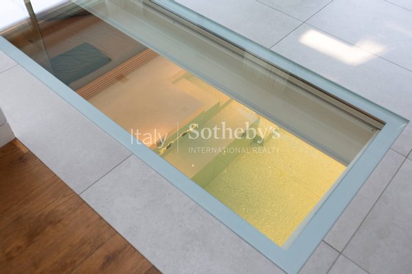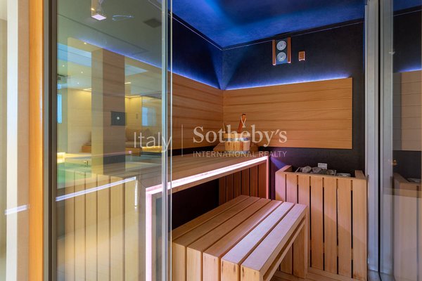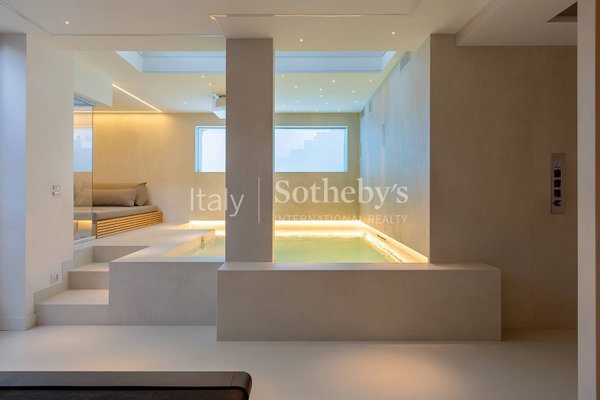 The lower level is dedicated to wellness and leisure, featuring a fully equipped gym, a spectacular spa with heated pool, a TV area, a sauna with shower, and a Turkish bath. Separate from the main areas are the laundry room, a wardrobe space, and access to an independent staff apartment.