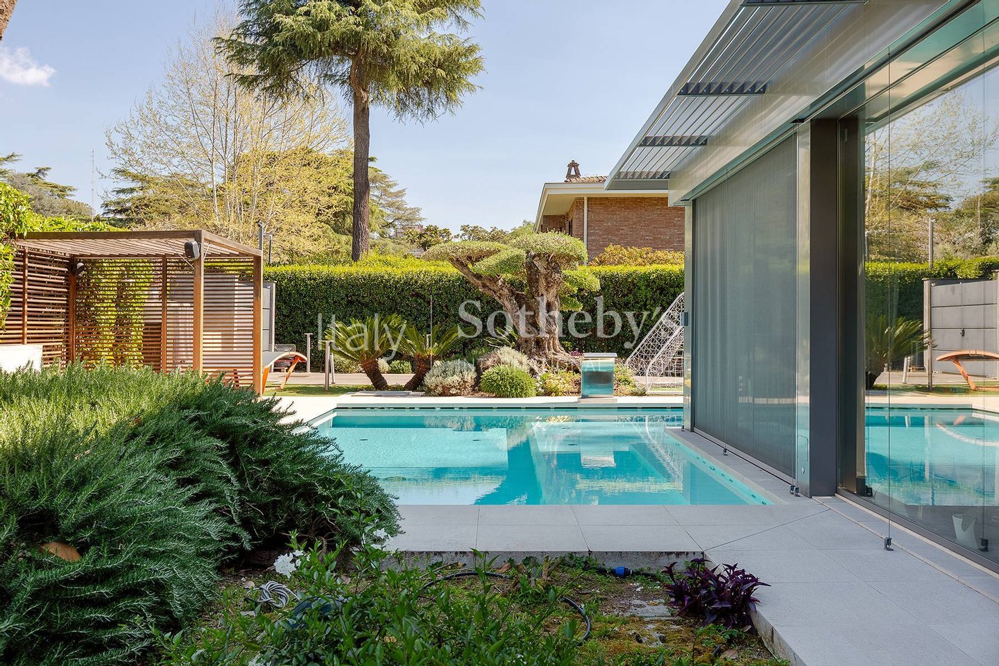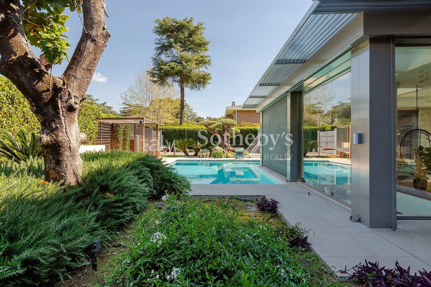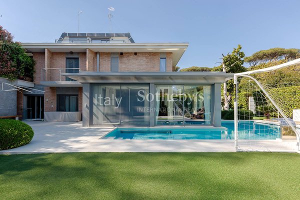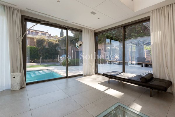 The interiors feature generous volumes: from the expansive living room and lounge area, glass walls open onto views of the stunning corner infinity pool. The open-plan kitchen is professional and modern. On the same level, there is a study-easily convertible into an additional bedroom-and a guest bathroom. Multiple exits on three sides lead directly to the private garden.
