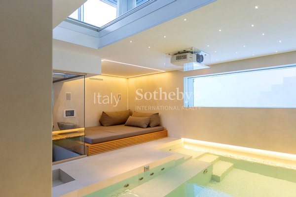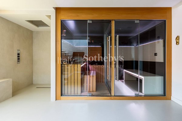 The lower level is dedicated to wellness and leisure, featuring a fully equipped gym, a spectacular spa with heated pool, a TV area, a sauna with shower, and a Turkish bath. Separate from the main areas are the laundry room, a wardrobe space, and access to an independent staff apartment.