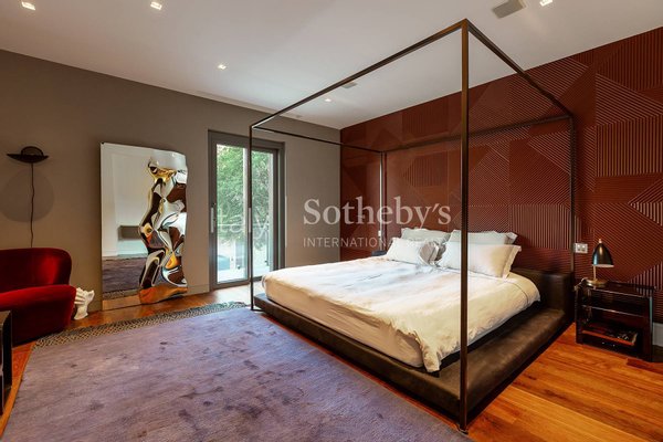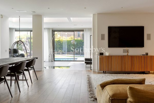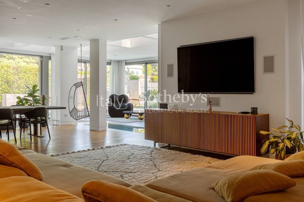 The interiors are exquisitely furnished with contemporary, high-end pieces, creating a refined, welcoming, and modern atmosphere. All systems are of superior standard, and the private garden accommodates two large car garages.