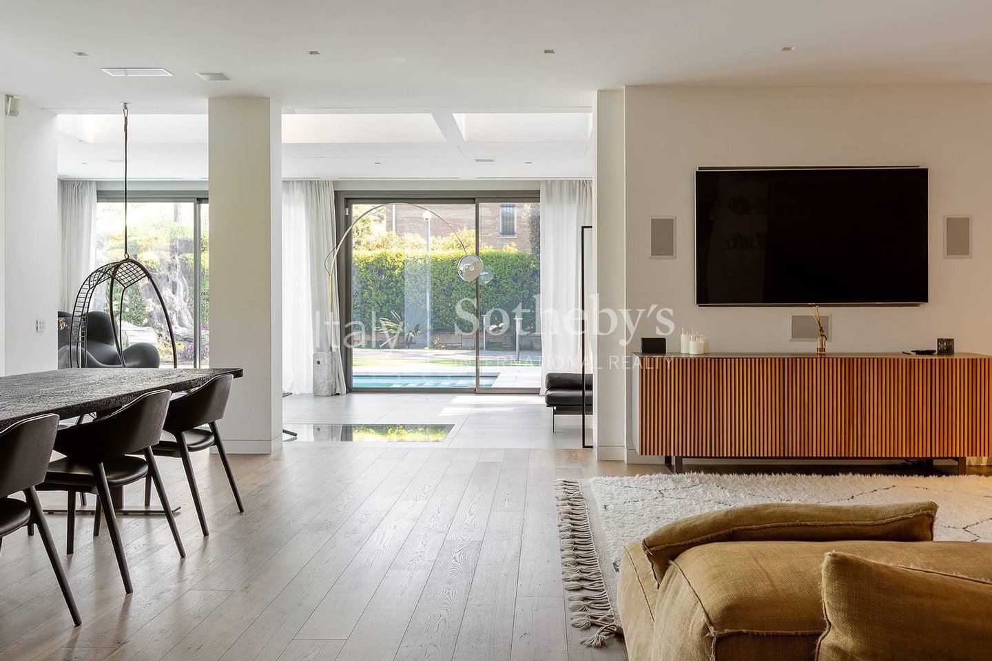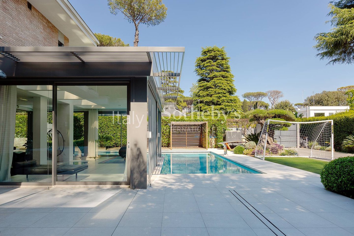 The interiors feature generous volumes: from the expansive living room and lounge area, glass walls open onto views of the stunning corner infinity pool. The open-plan kitchen is professional and modern. On the same level, there is a study-easily convertible into an additional bedroom-and a guest bathroom. Multiple exits on three sides lead directly to the private garden.